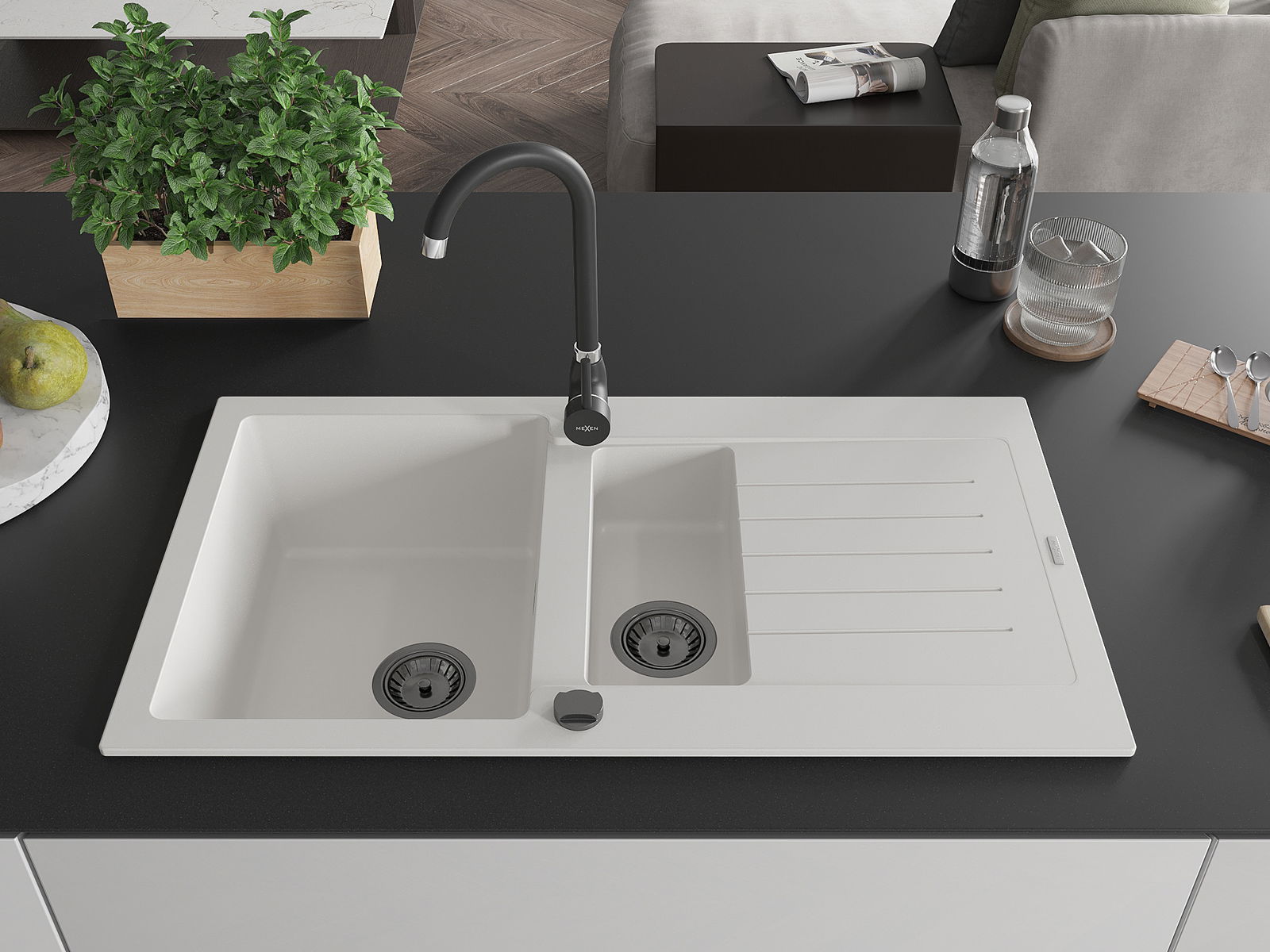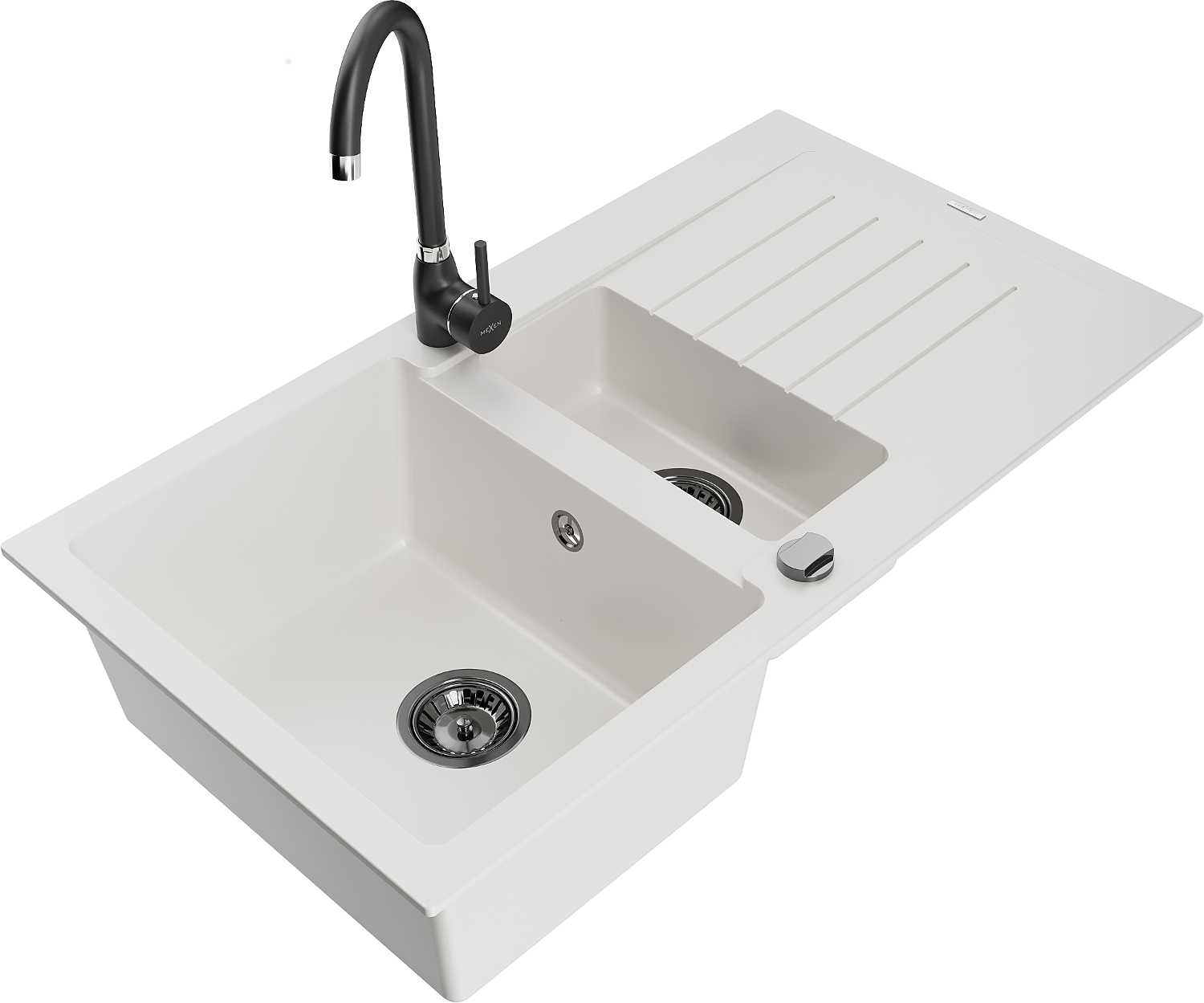 Mexen Matias žulový drez s 1,5-komorou, s odkvapkávačom a kuchynskou batériou Telma, biely - 6502-20-670200-70
