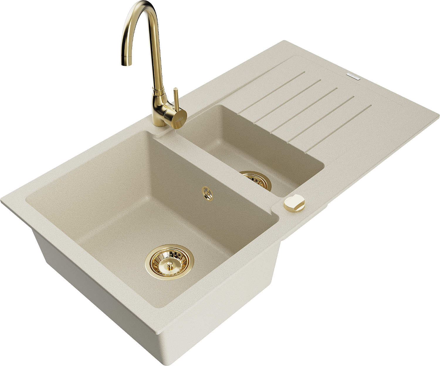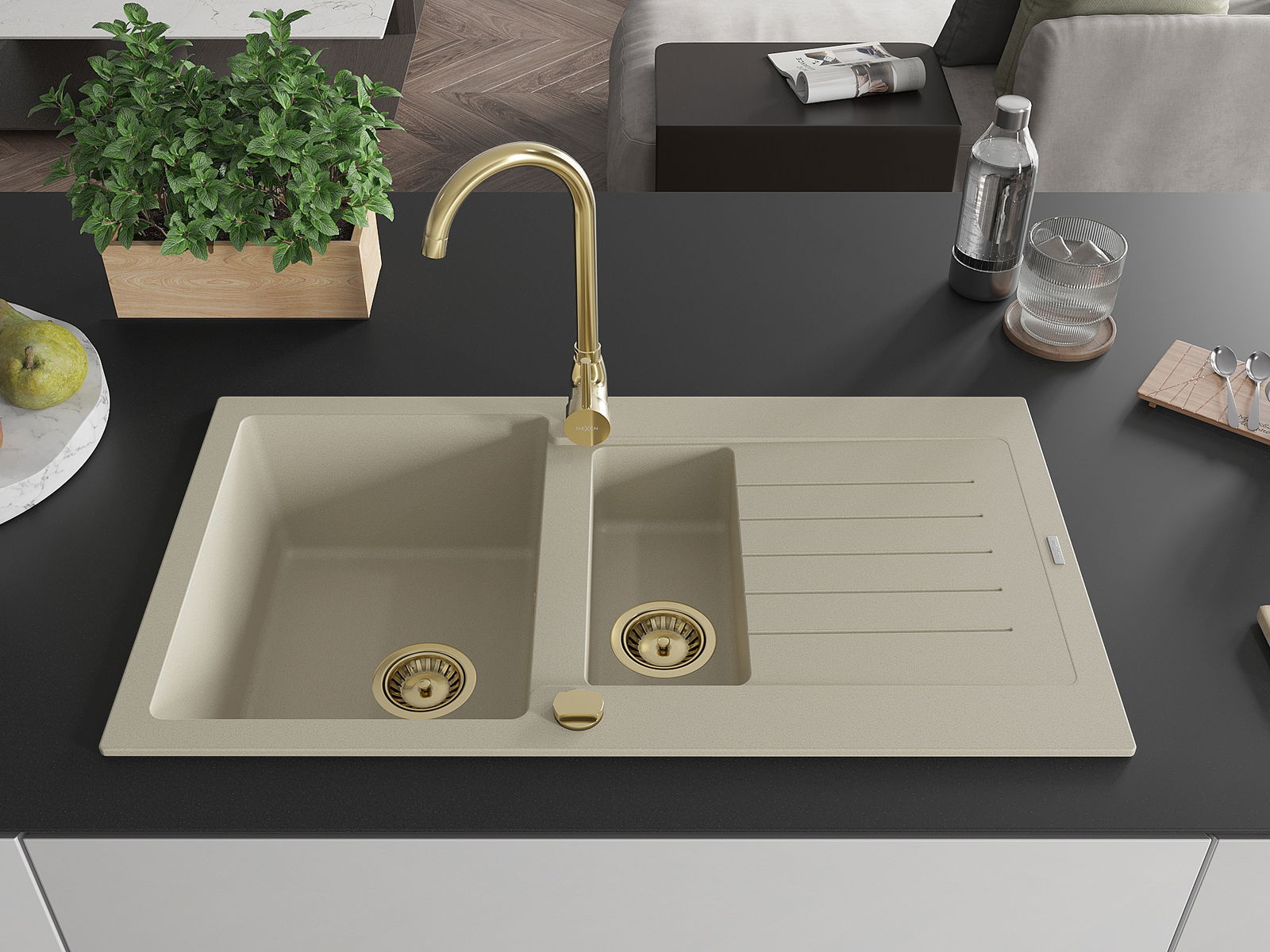 Mexen Matias granitový drez 1,5-komorový s odkvapkávačom a kuchynskou batériou Telma, béžový - 6502-69-670200-50