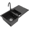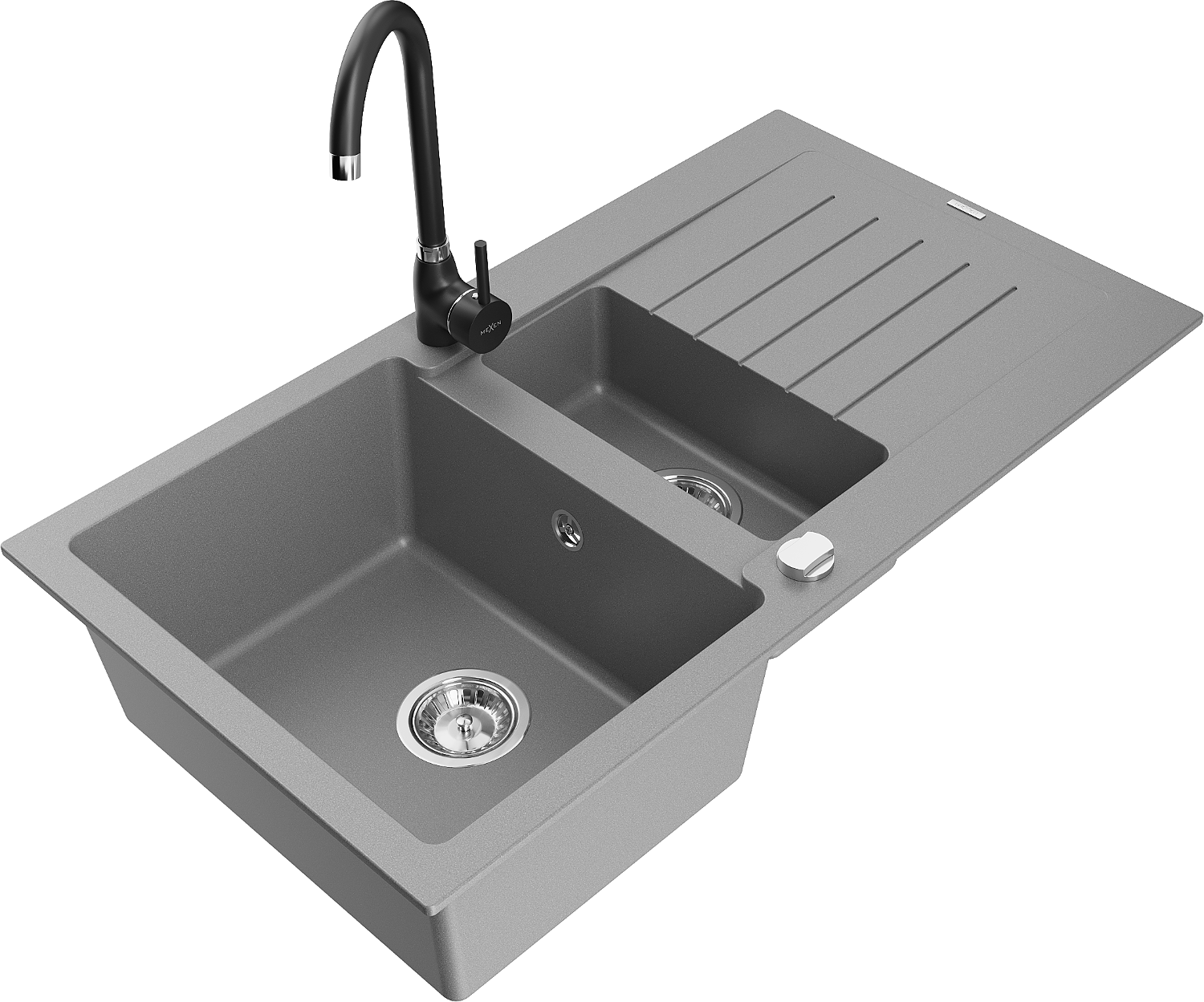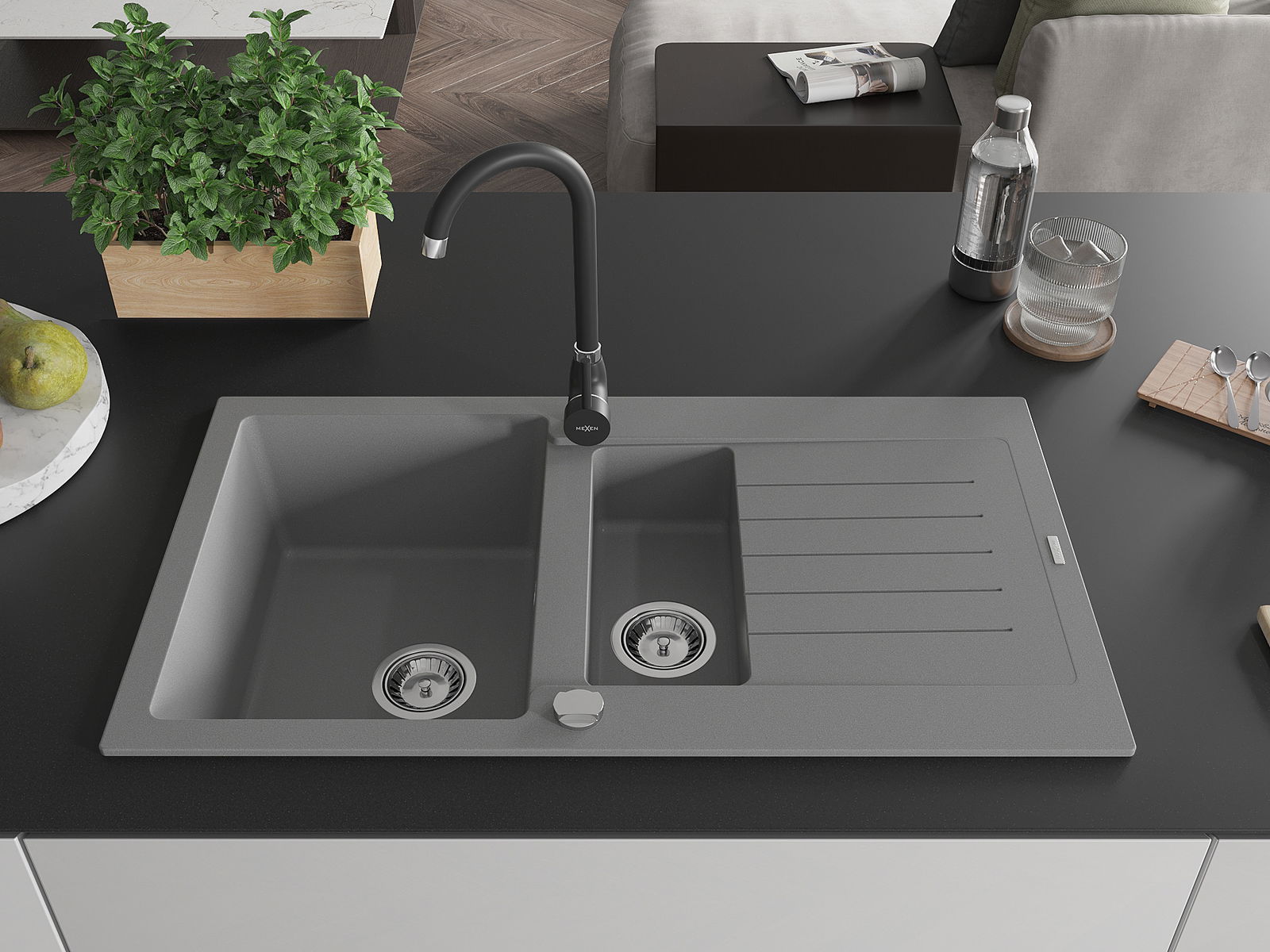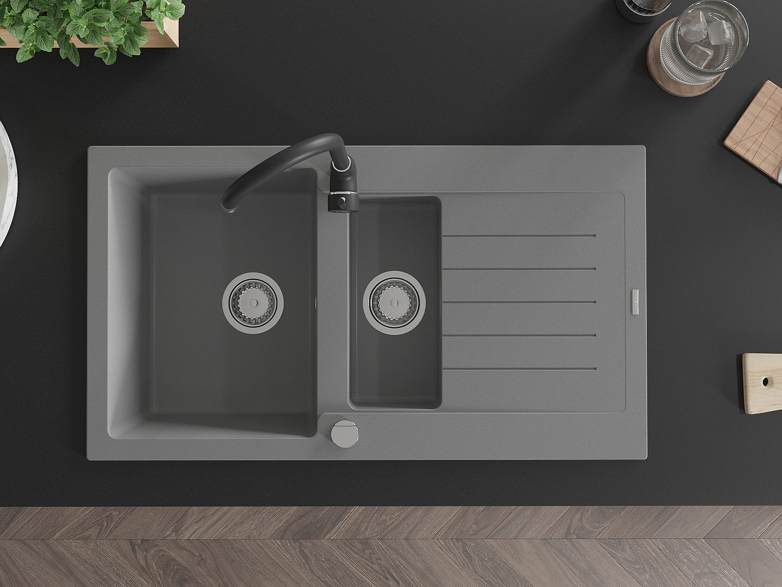 Mexen Matias granitový drez 1,5-komorový s odkvapkávačom a kuchynskou batériou Telma, sivý - 6502-71-670200-70