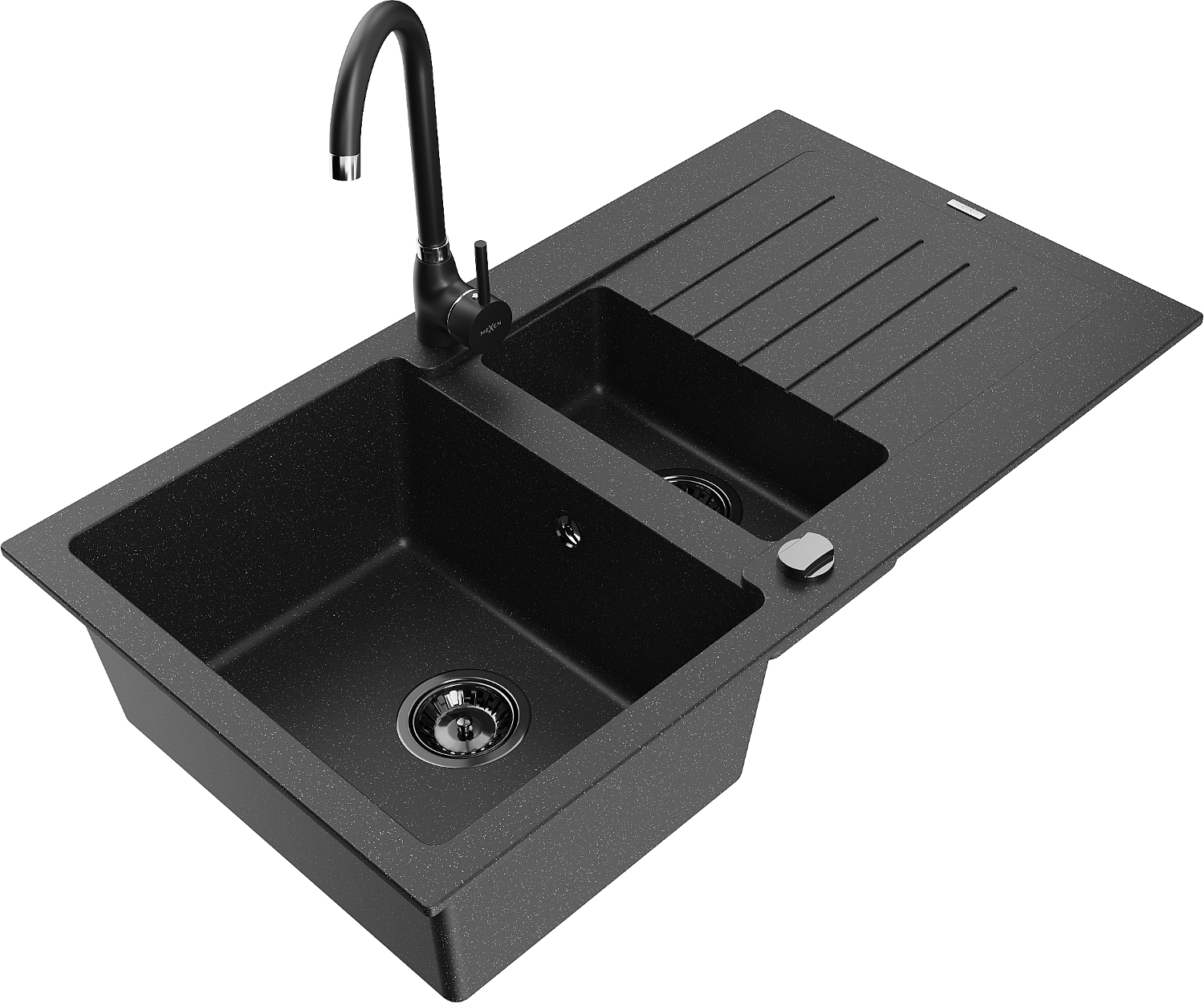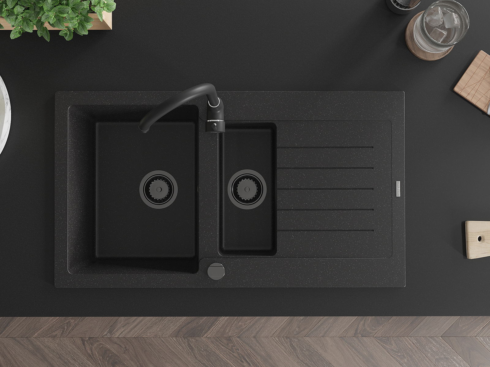 Mexen Matias granitový drez 1,5-komorový s odkvapkávačom a kuchynskou batériou Telma, čierny/strieborný - 6502-73-670200-70-B