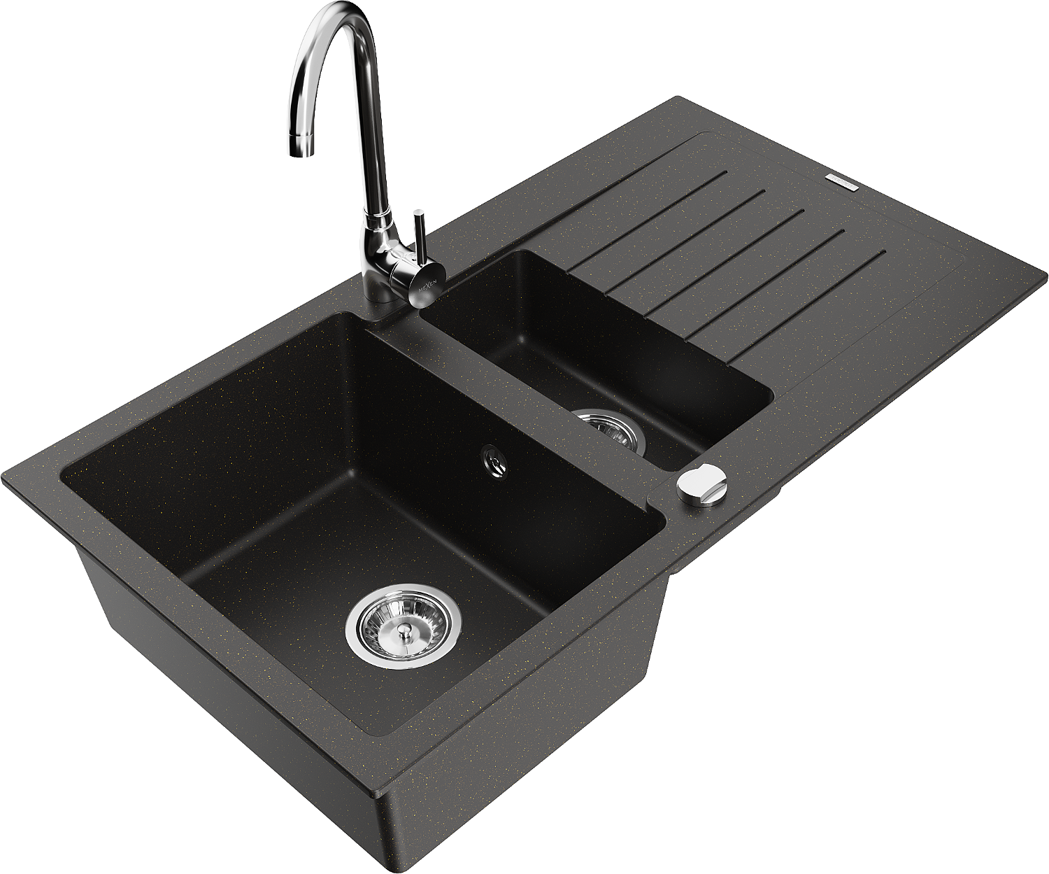 Mexen Matias granitový drez 1,5-komorový s odkvapkávačom a kuchynskou batériou Telma, čierny/zlatý - 6502-75-670200-00