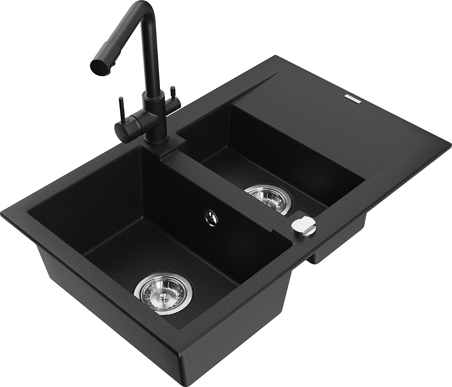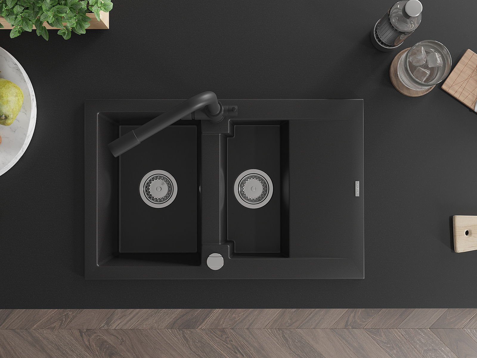 Mexen Gaspar granitový drez 1,5-komorový s odkvapkávačom a kuchynskou batériou Duero, čierny - 6507-77-671600-70