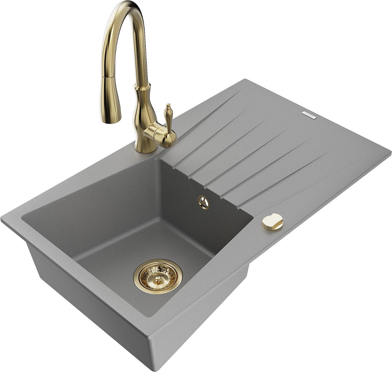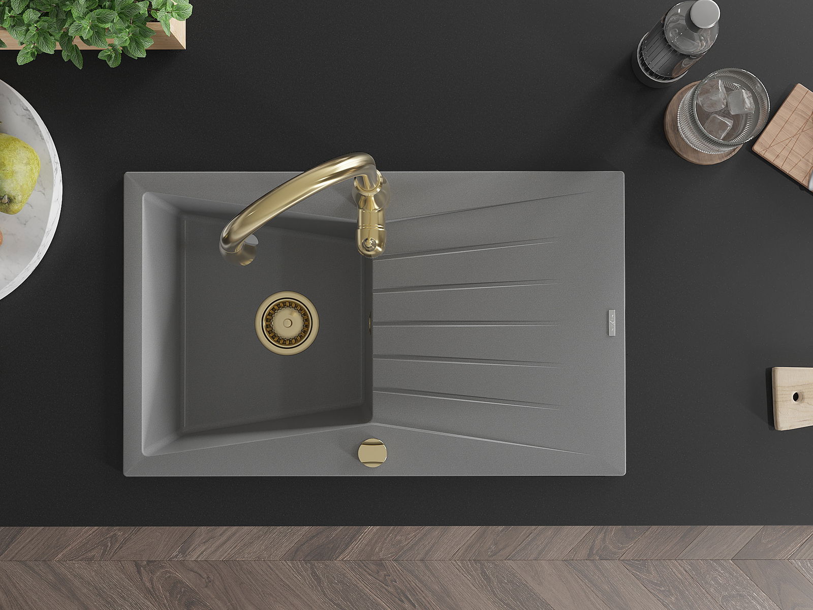 Mexen Cesar granitový kuchynský drezu s 1 komorou s odkvapkávačom a kuchynskou batériou Savita, sivý - 6514-71-672601-50