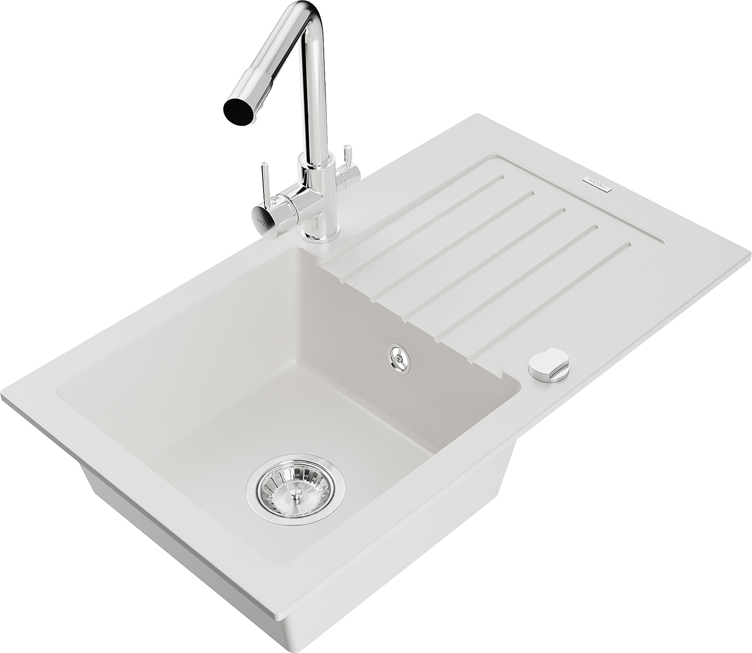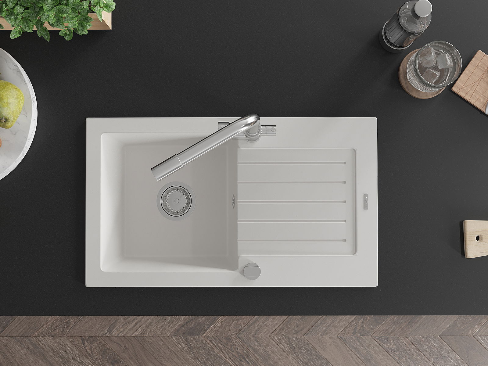 Mexen Pablo žulový drez s jednou komorou a odkvapkávačom a kuchynská batéria Duero, biela - 6510-20-671600-00