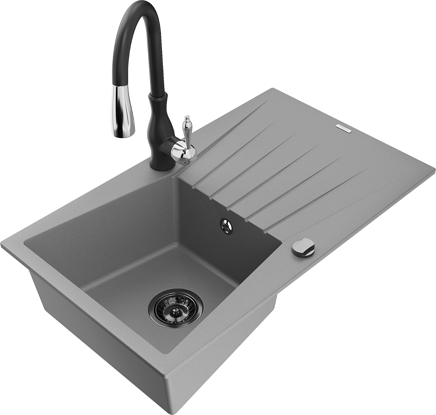 Mexen Cesar granitový drez s 1 komorou, odkvapkávačom a kuchynskou batériou Savita, sivý - 6514-71-672601-70-B