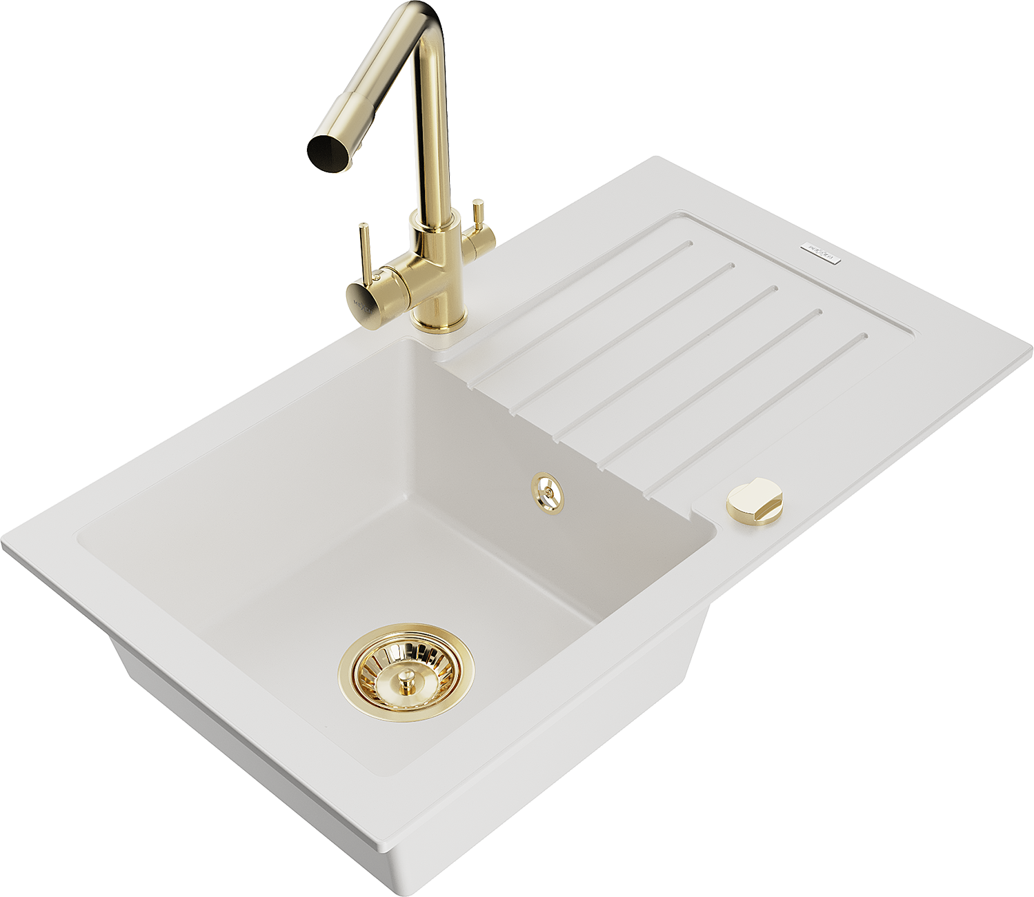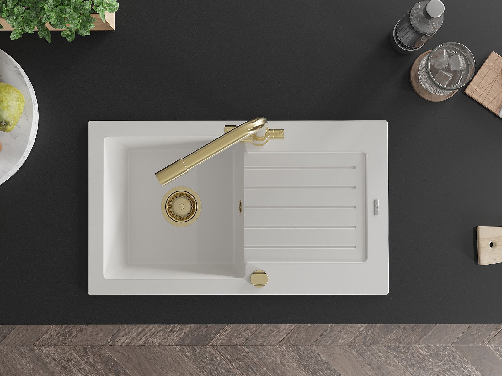 Mexen Pablo žulový kuchynský drez s 1 komorou a odkvapkávačom a kuchynská batéria Duero, biela - 6510-20-671600-50