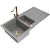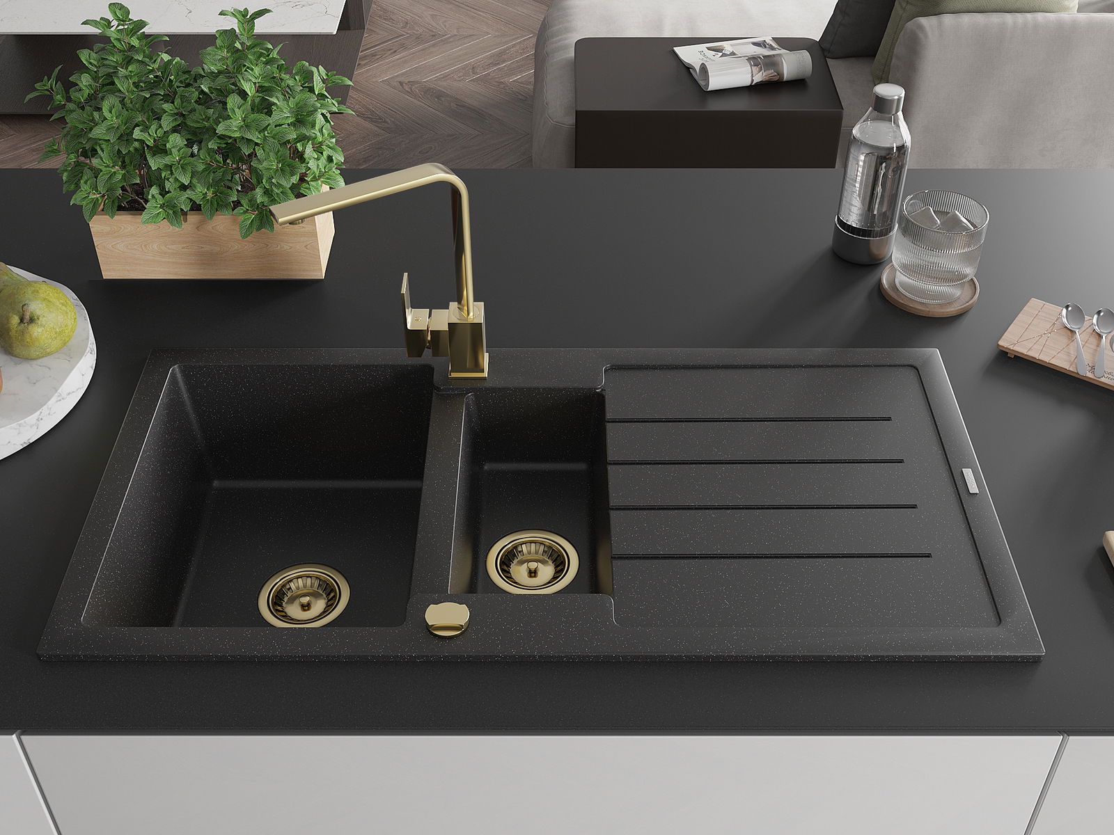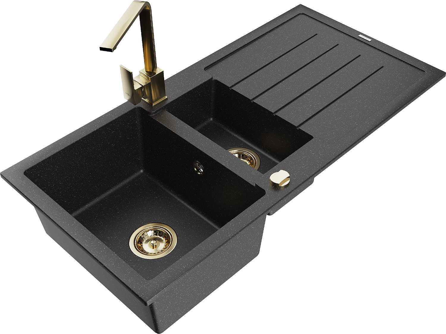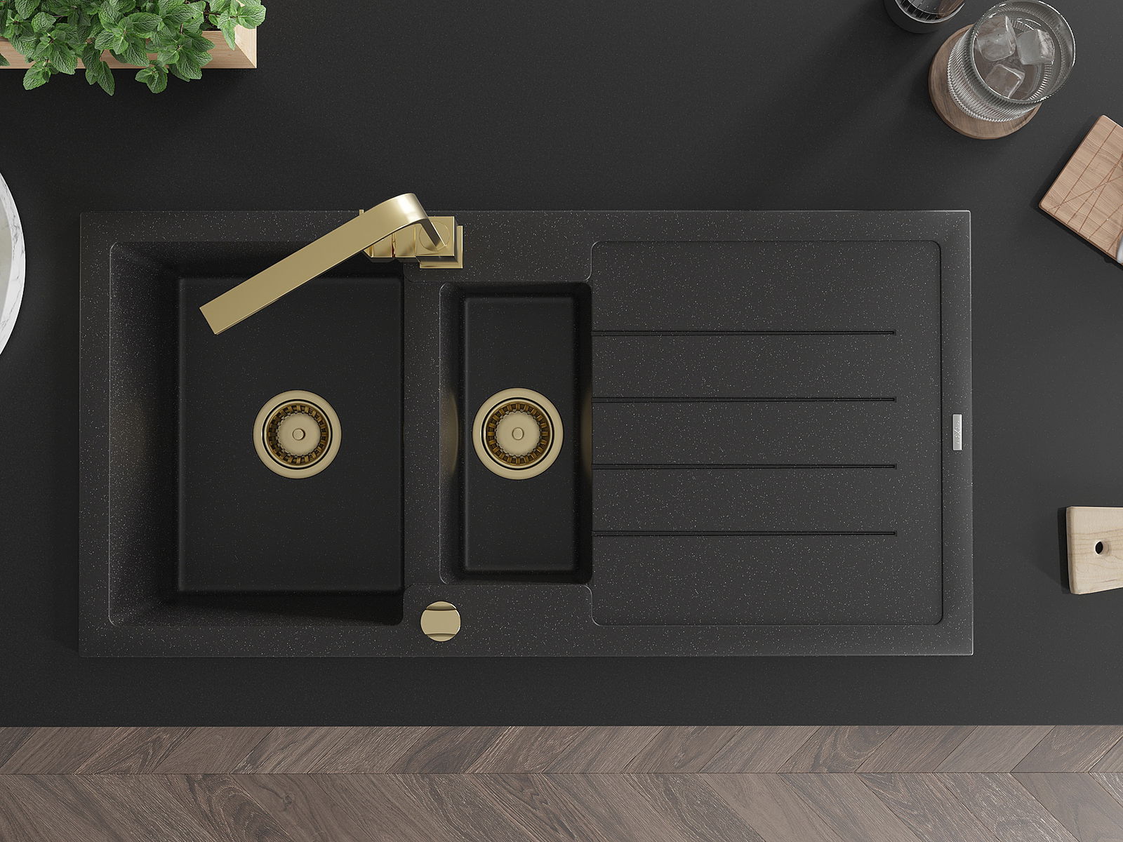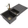 Mexen Andres granitový drez 1,5-komorový s odkvapkávačom a kuchynskou batériou Rita, čierny/strieborný metalický