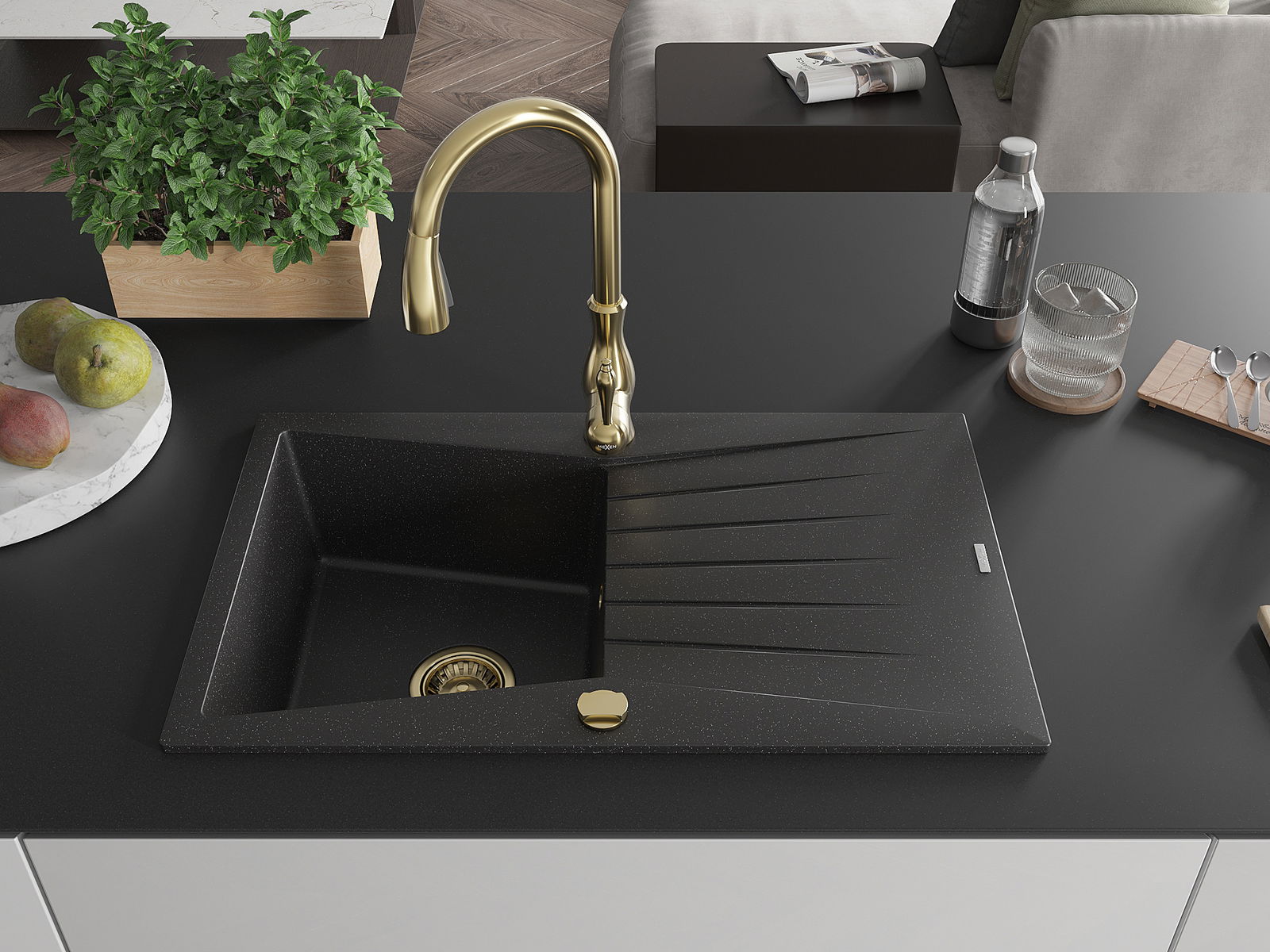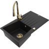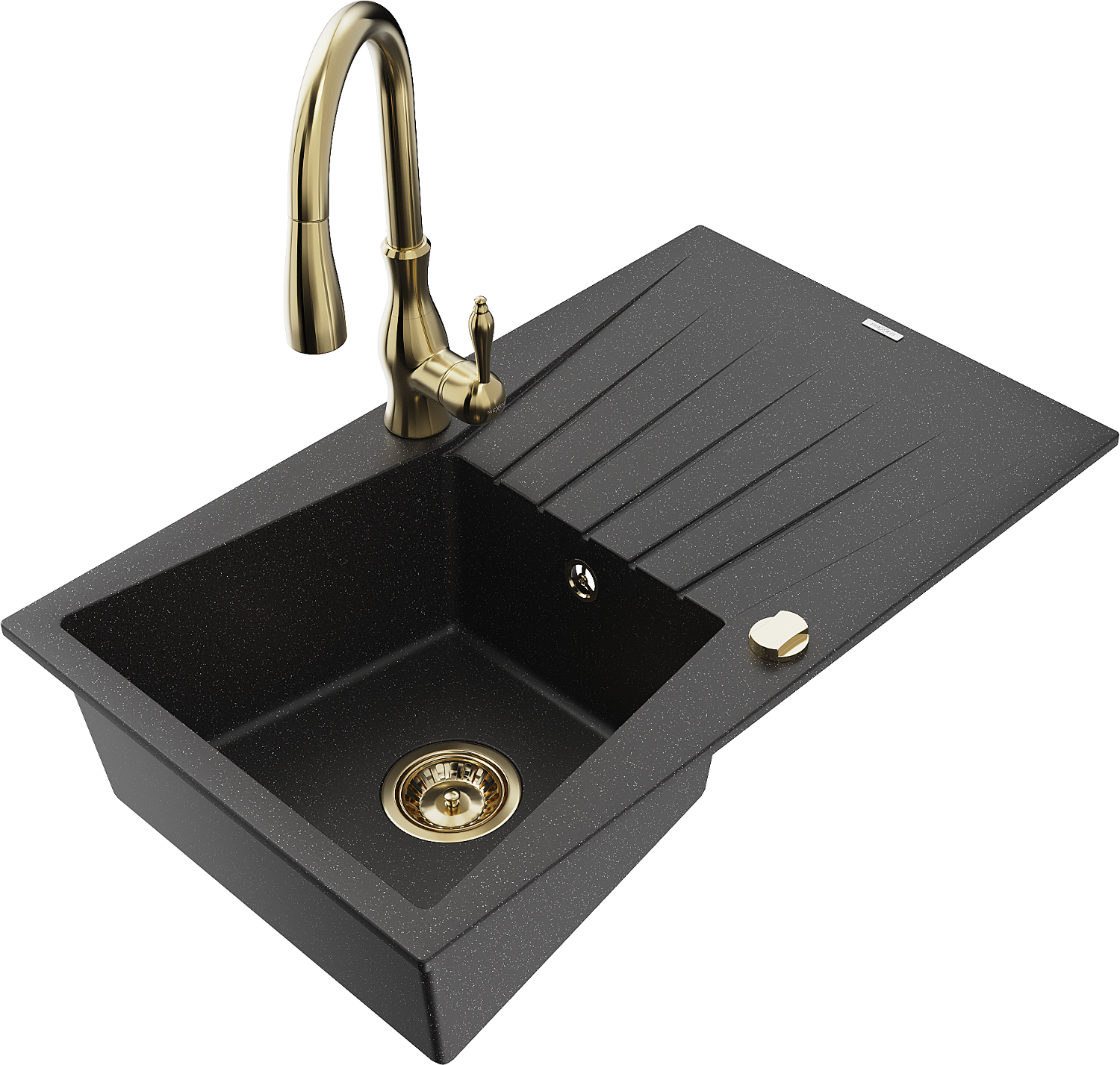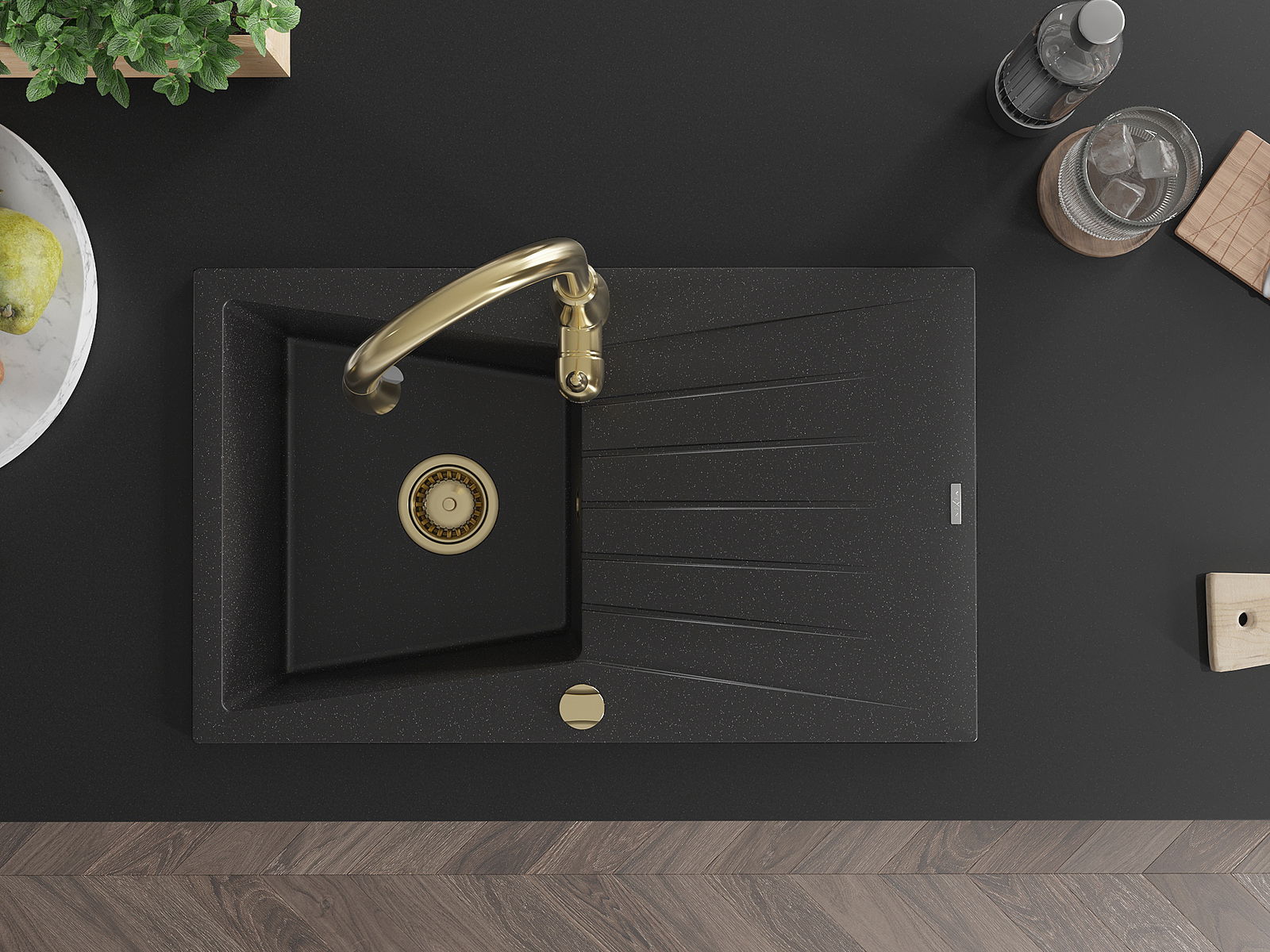 Mexen Cesar granitový drez s 1 komorou s odkvapkávacou plochou a kuchynskou batériou Savita, čierny/strieborný metalik