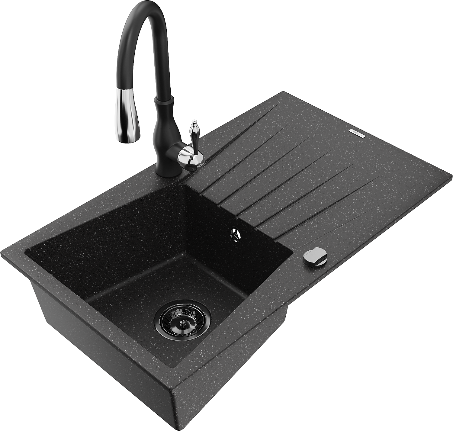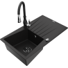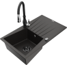 Mexen Cesar granitový kuchynský drez s 1 komorou s odkvapkávačom a kuchynskou batériou Savita, čierny/strieborný