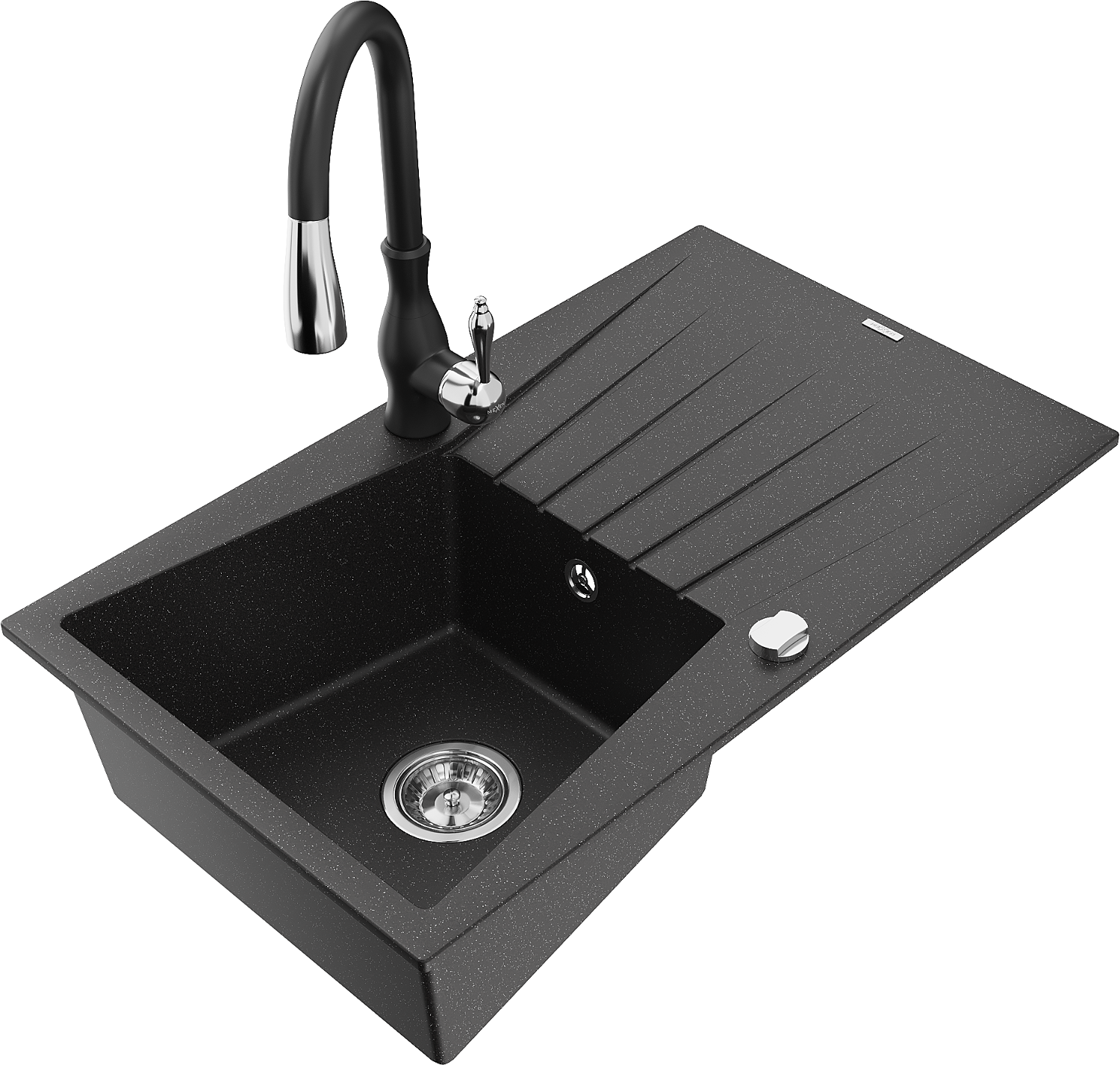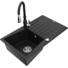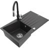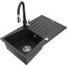 Mexen Cesar Granitový kuchynský drez s 1 komorou, odkvapkávacou plochou a kuchynskou batériou Savita, čierny/strieborný
