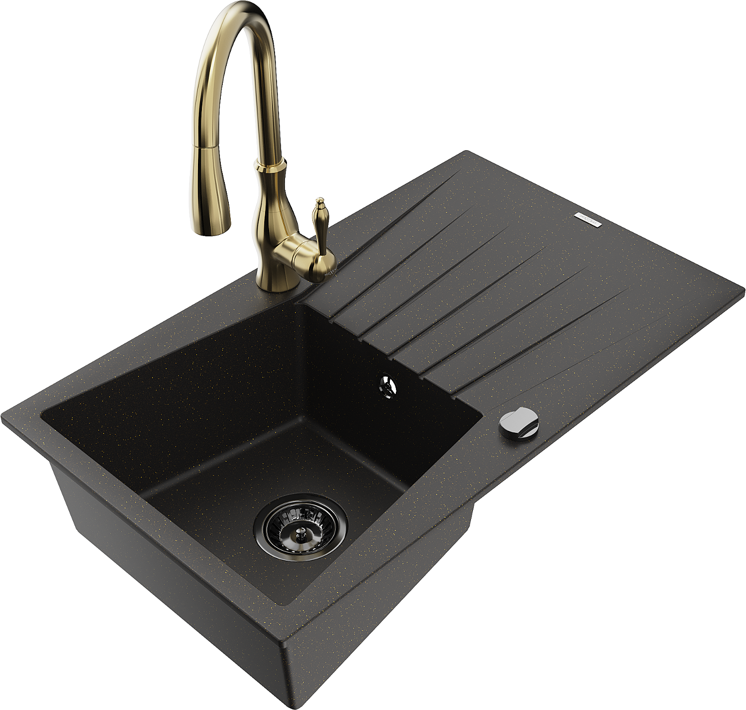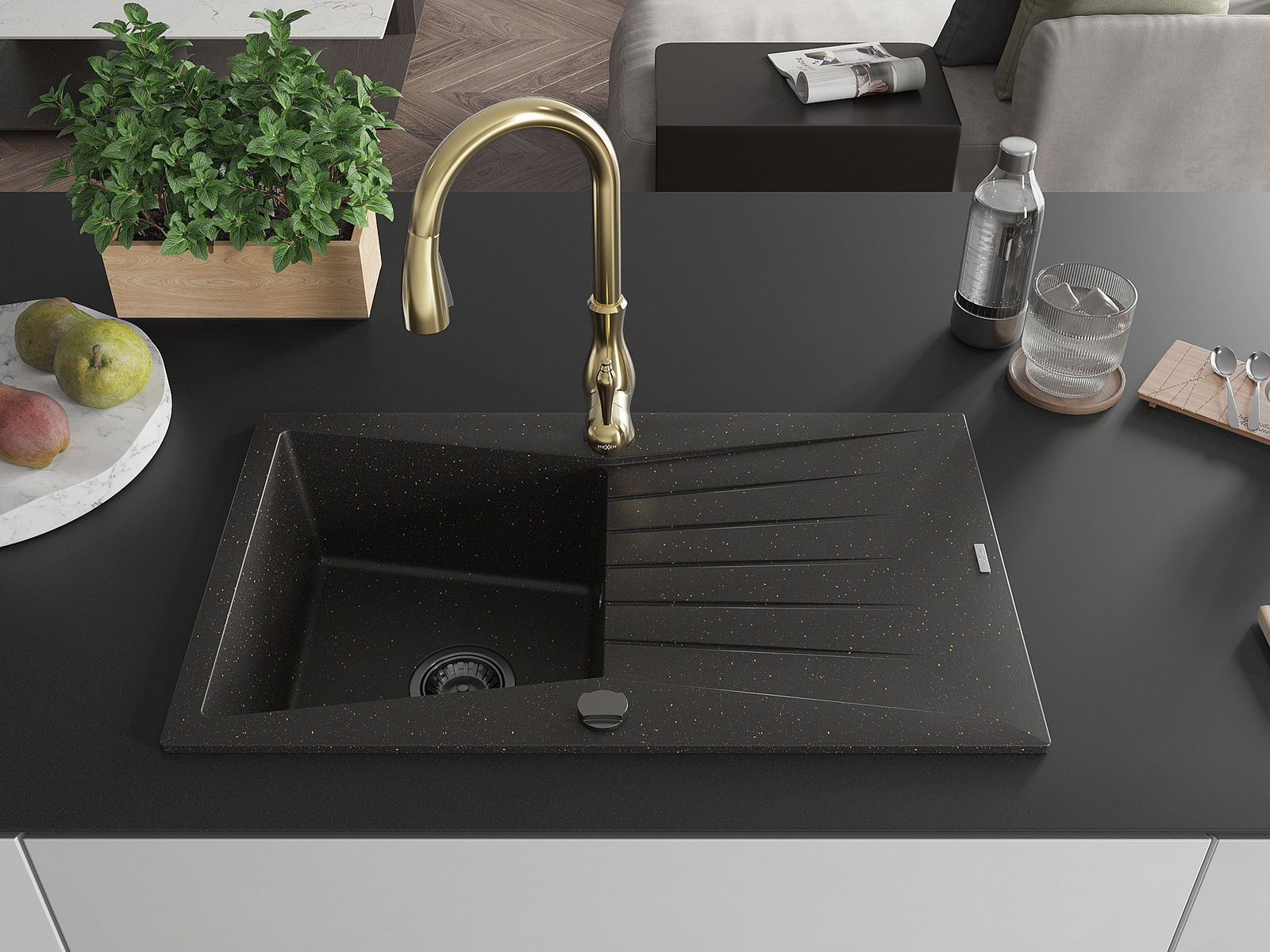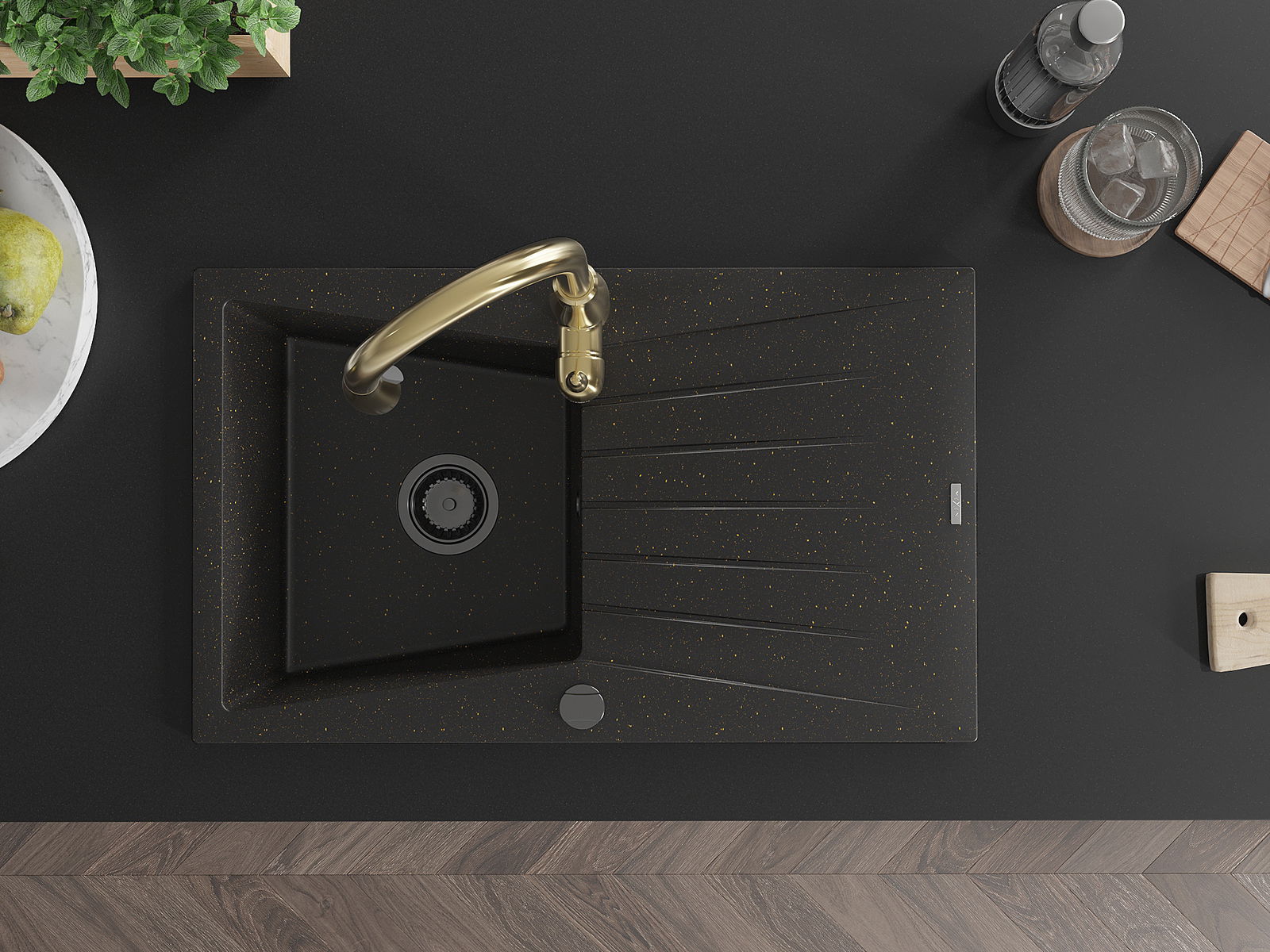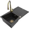 Mexen Cesar granitový drez s jednou komorou s odkvapkávaním a kuchynskou batériou Savita, čierno/zlatý metalický