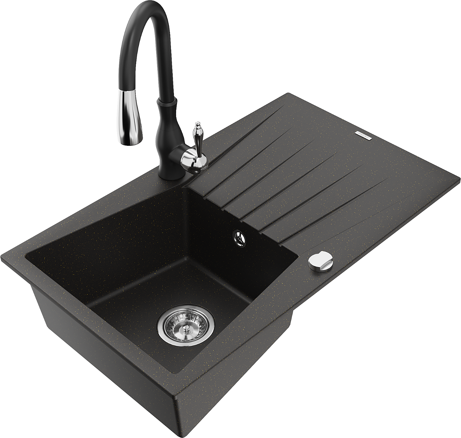 Mexen Cesar granitový drez s 1 komorou, odkvapkávačom a kuchynskou batériou Savita, čierny/zlatý metalický - 6514-75-672601-70