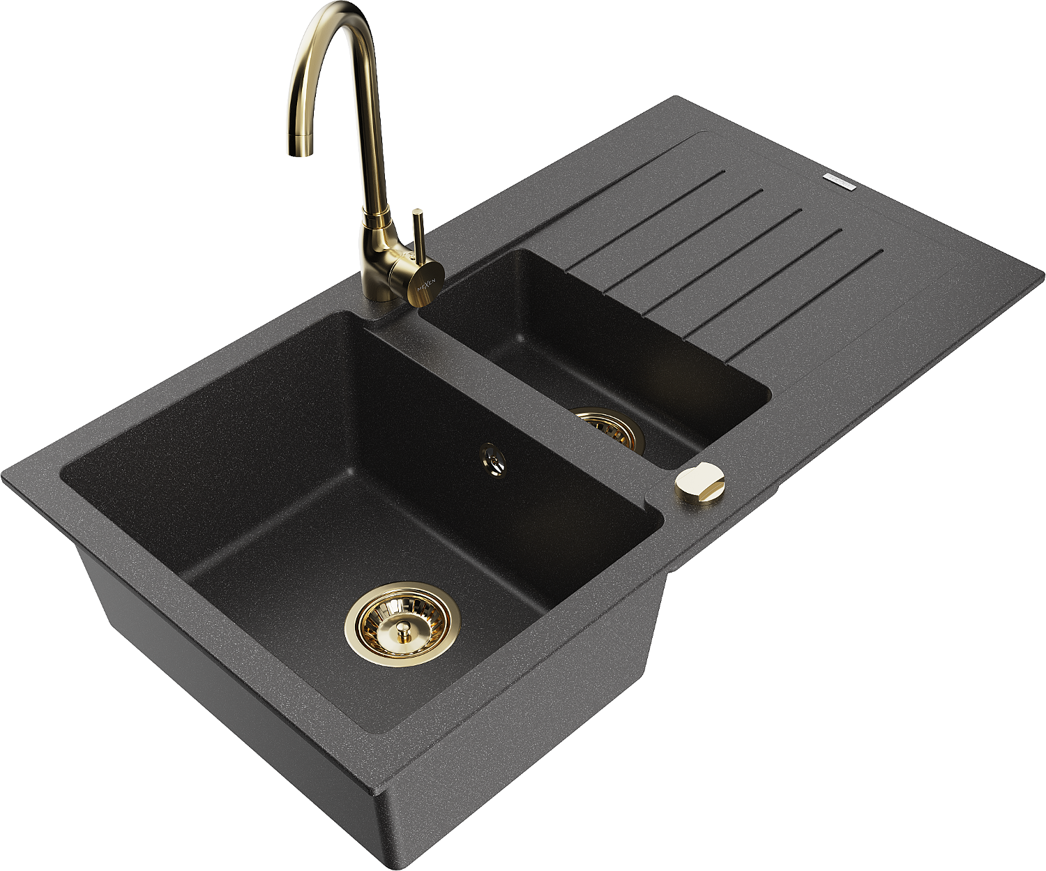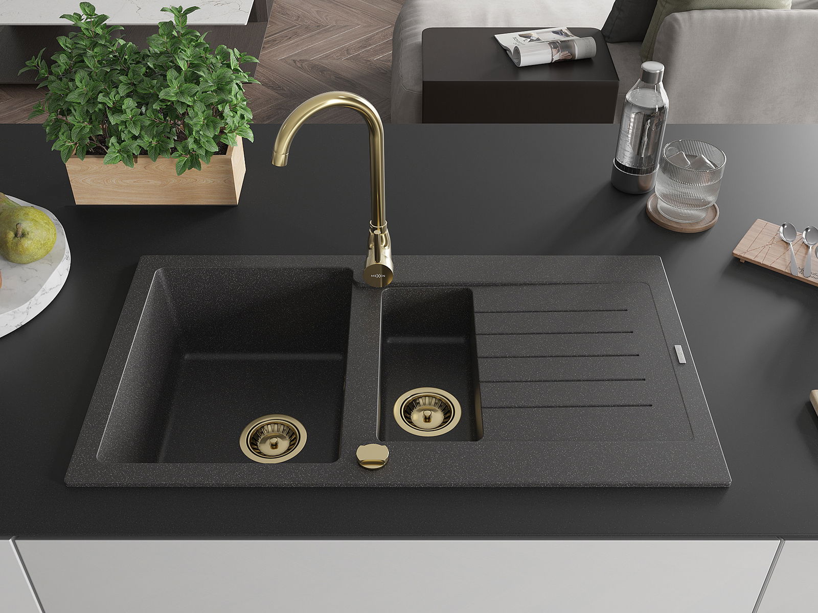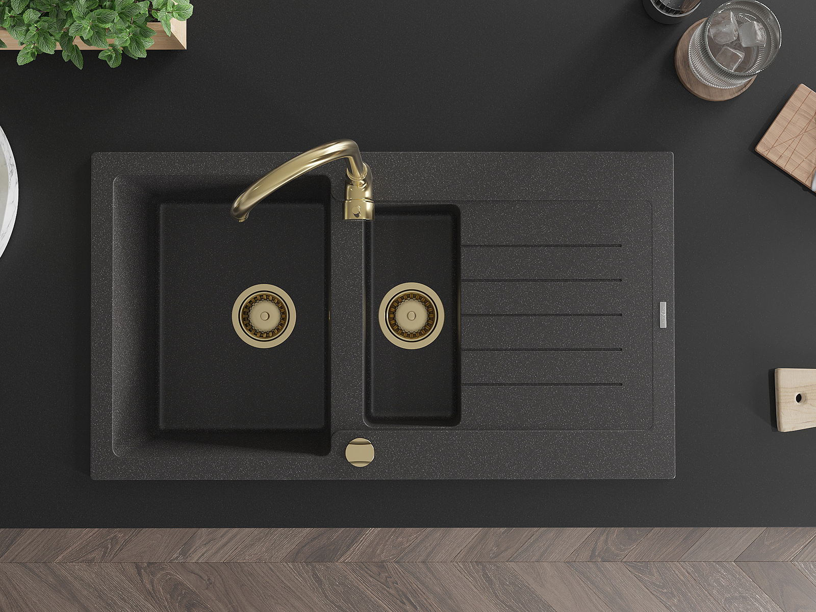 Mexen Matias granitový drez 1,5-komorový s odkvapkávačom a kuchynskou batériou Telma, čierny škvrnitý