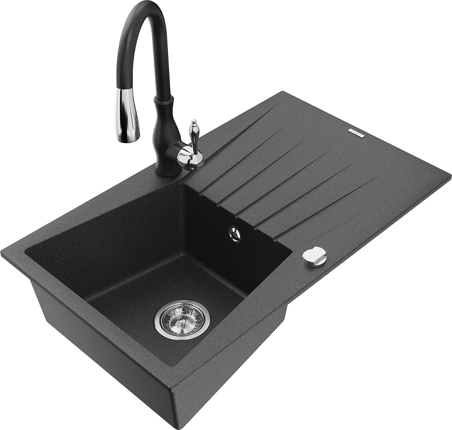 Mexen Cesar kameninový drez 1-komorový s odkvapkávačom a kuchynskou batériou Savita, čierny škvrnitý - 6514-76-672601-70