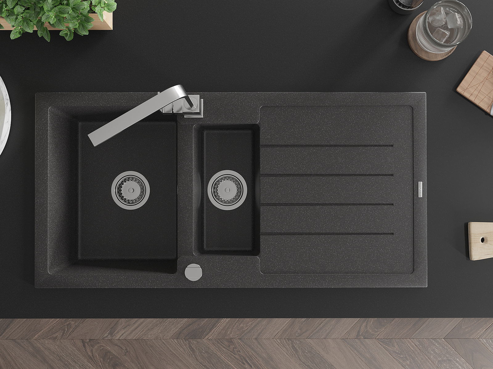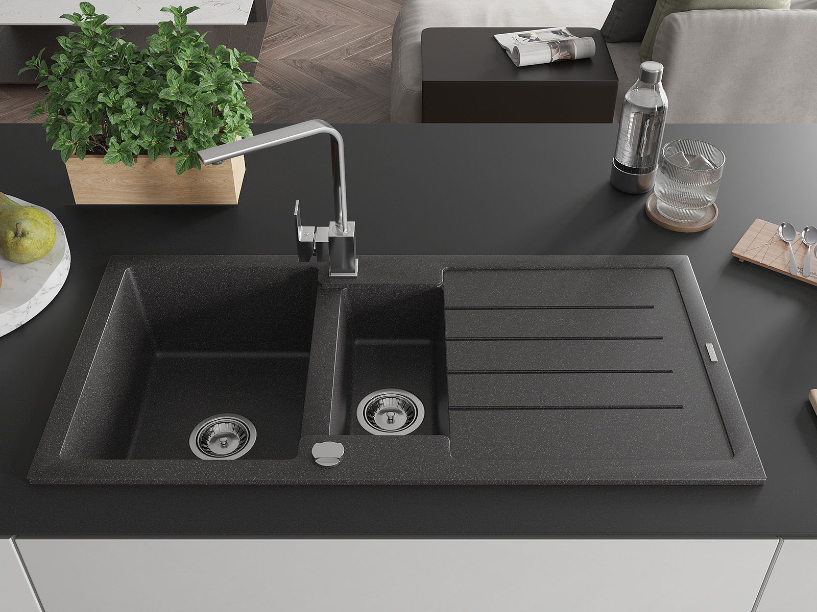 Povrch umývadla je odolný voči škvrnám a sfarbeniu, vďaka čomu sa ľahko čistí a zachováva si svoju farbu po dlhú dobu. Estetický a prakticky dopĺňajúci každú kuchyňu.