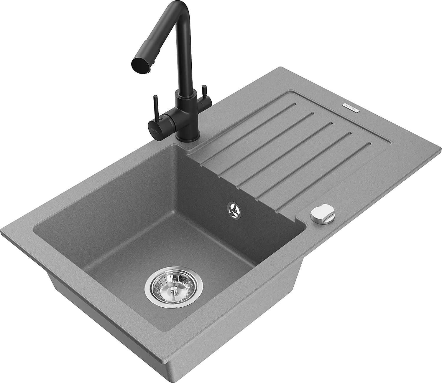 Mexen Pablo jednokomorový žulový drez s odkvapkávacou plochou a kuchynskou batériou Duero, sivý - 6510-71-671600-70