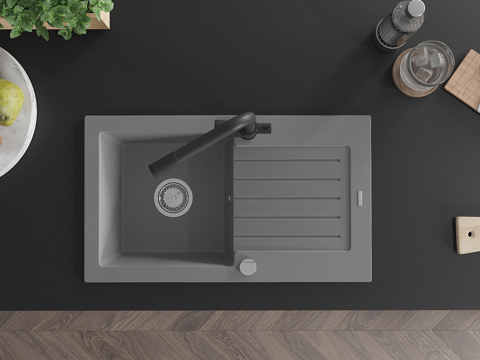 Povrch kuchynského drezu je odolný voči škvrnám a zafarbeniu, vďaka čomu sa ľahko udržiava a zachováva svoju farbu počas dlhého obdobia používania. Estetický a praktický doplnok pre každú kuchyňu.
