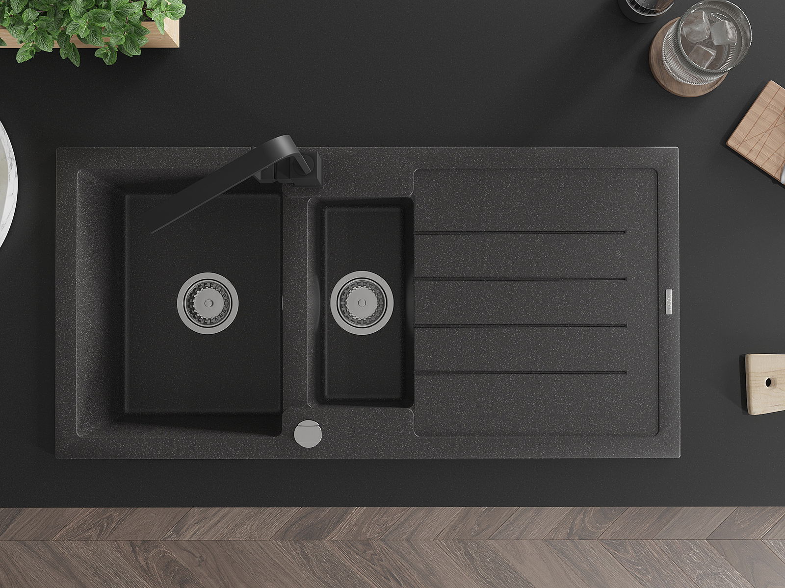 Mexen Andres granitový drez s 1,5 komorou s odkvapkávačom a kuchynskou batériou Rita, čierny s bodkami - 6515-76-670300-70