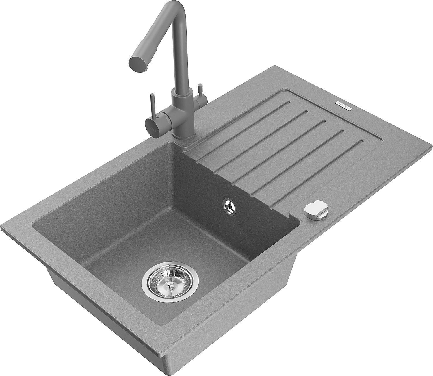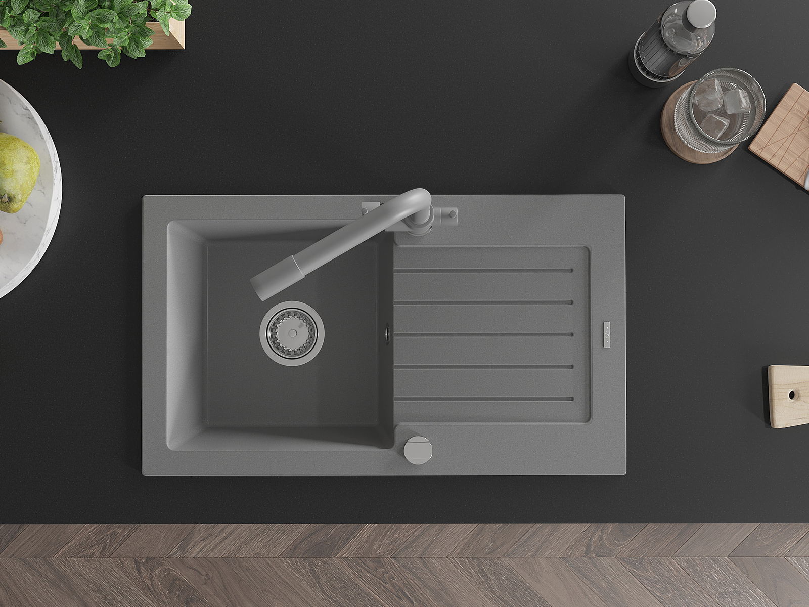 Mexen Pablo žulový kuchynský drez s 1 komorou, odkvapkávacou plochou a kuchynskou batériou Duero, sivý - 6510-71-671600-71