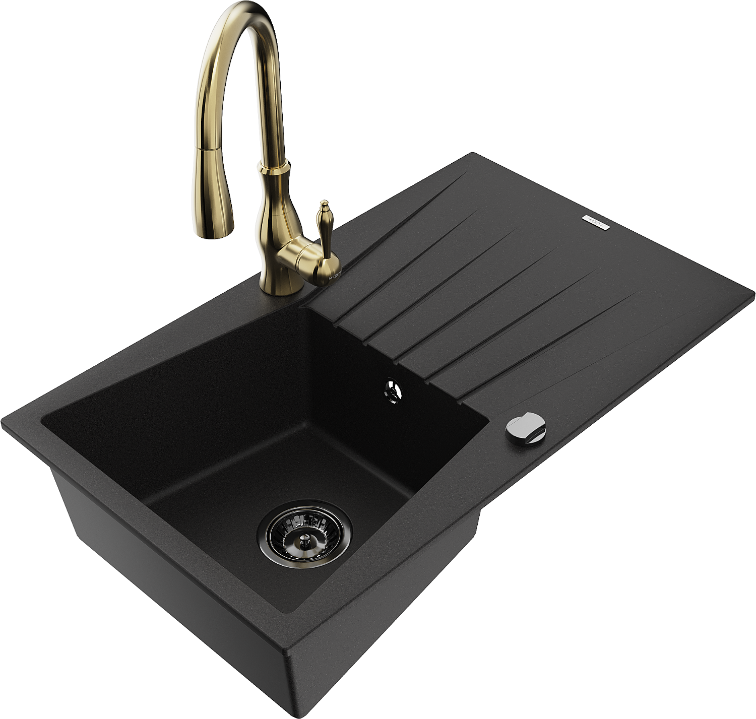 Mexen Cesar žulový kuchynský drez 1-komorový s odkvapkávačom a kuchynskou batériou Savita, čierny - 6514-77-672601-50-B