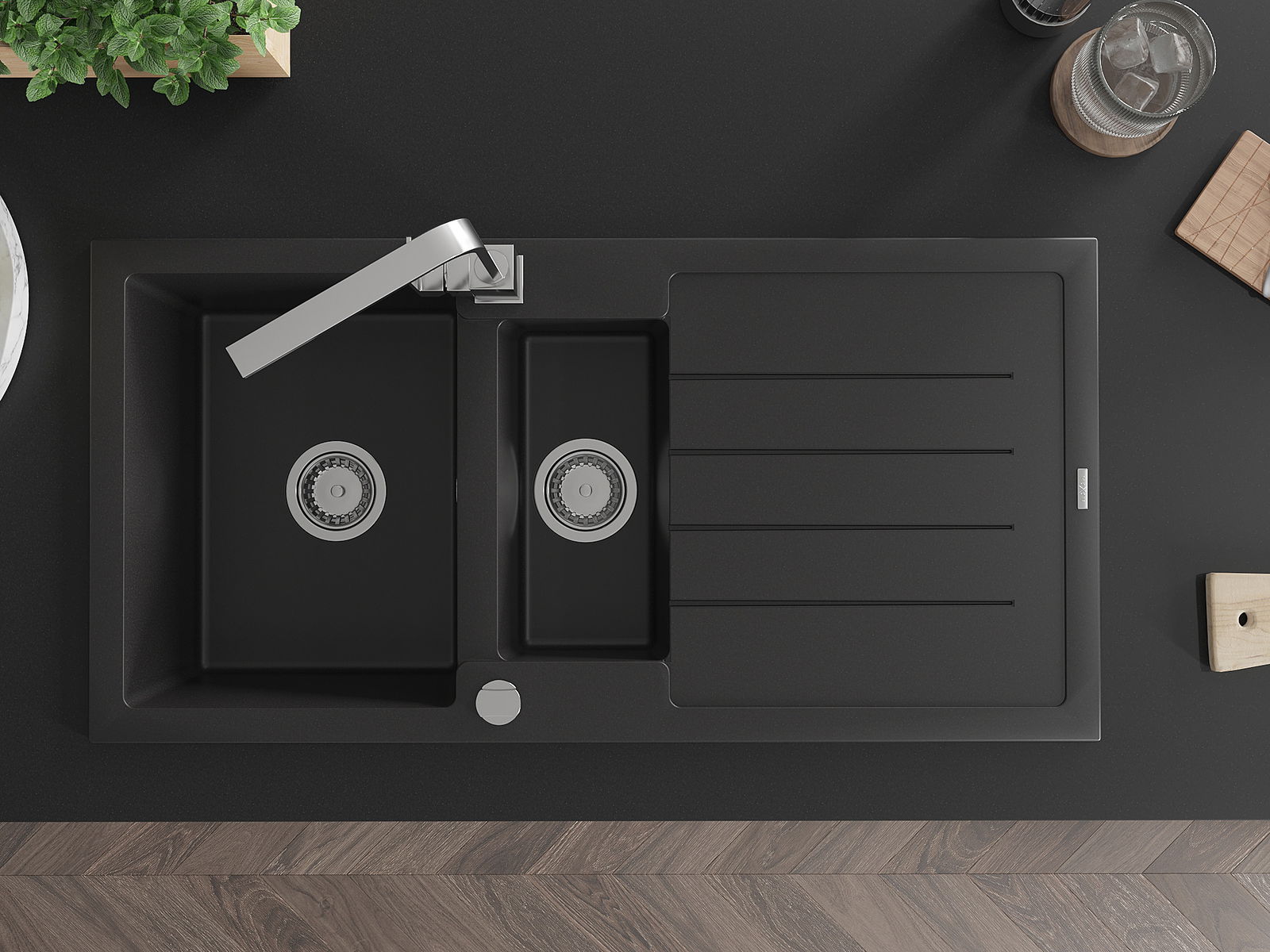 Povrch kuchynského drezu je odolný voči škvrnám a zafarbeniu, vďaka čomu sa ľahko udržiava a zachováva svoju farbu počas dlhého obdobia používania. Estetický a praktický doplnok pre každú kuchyňu.