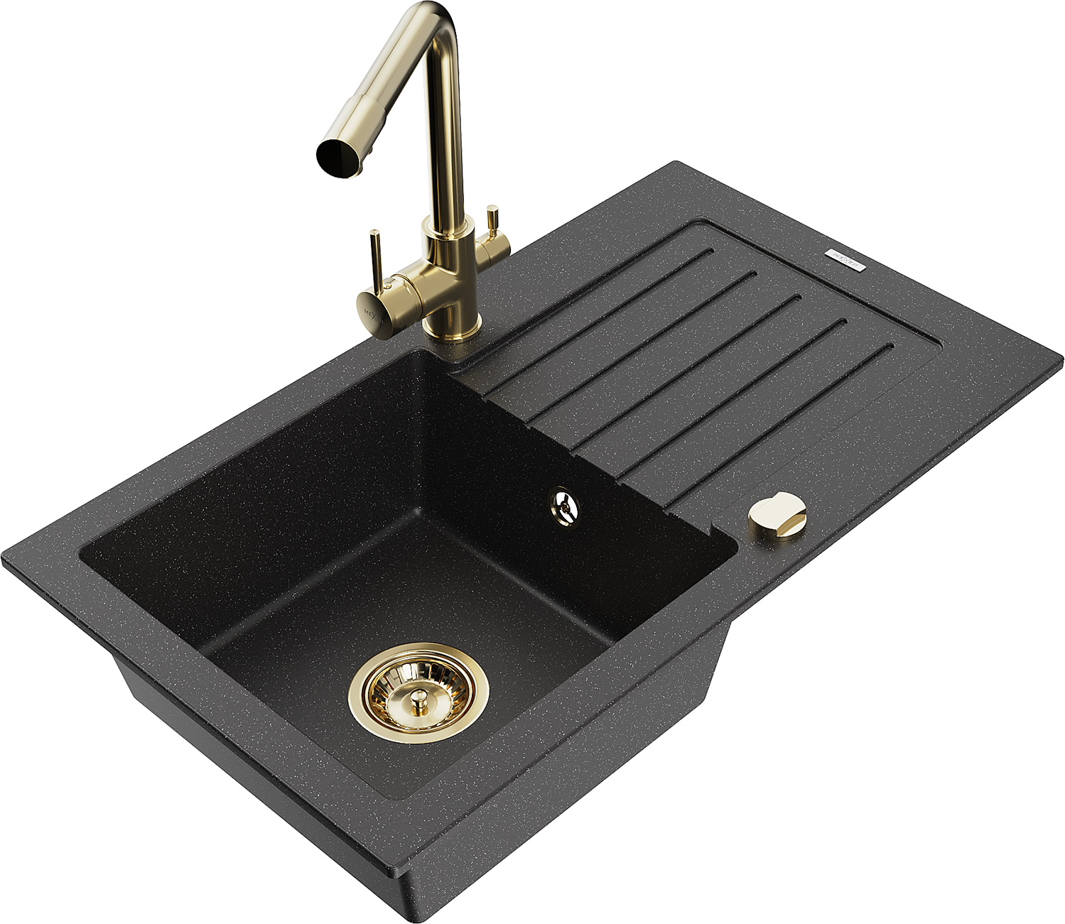 Mexen Pablo granitový drez s 1 komorou, odkvapkávačom a kuchynskou batériou Duero, čierny/strieborný metalik