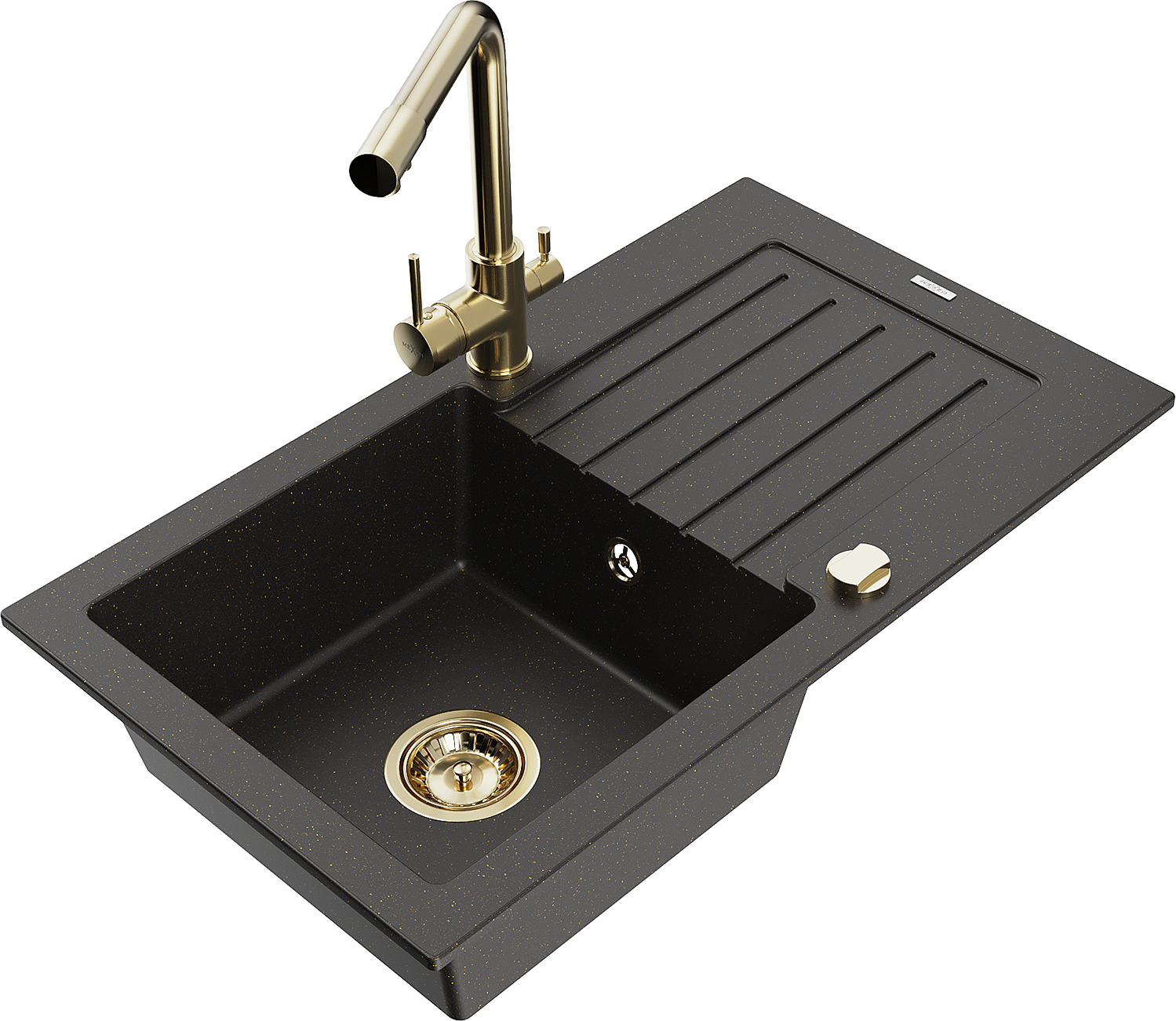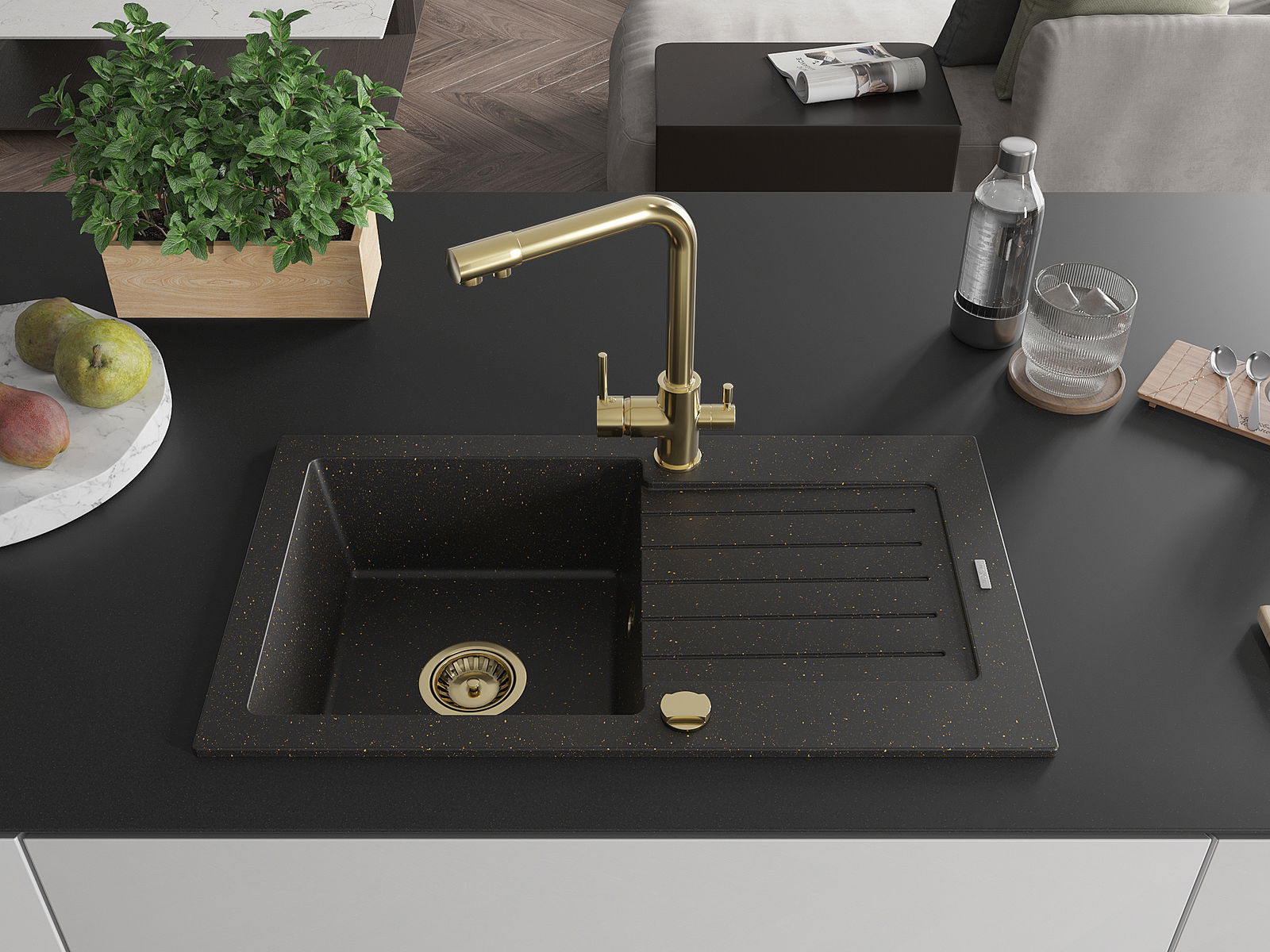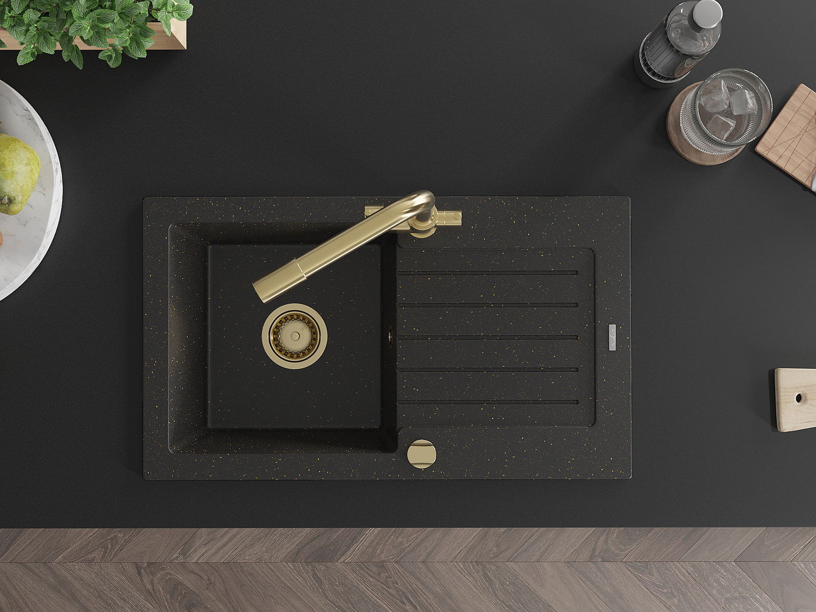 Mexen Pablo granitový drez 1-komorový s odkvapkávačom a kuchynskou batériou Duero, čierny/zlatý metalík - 6510-75-671600-50