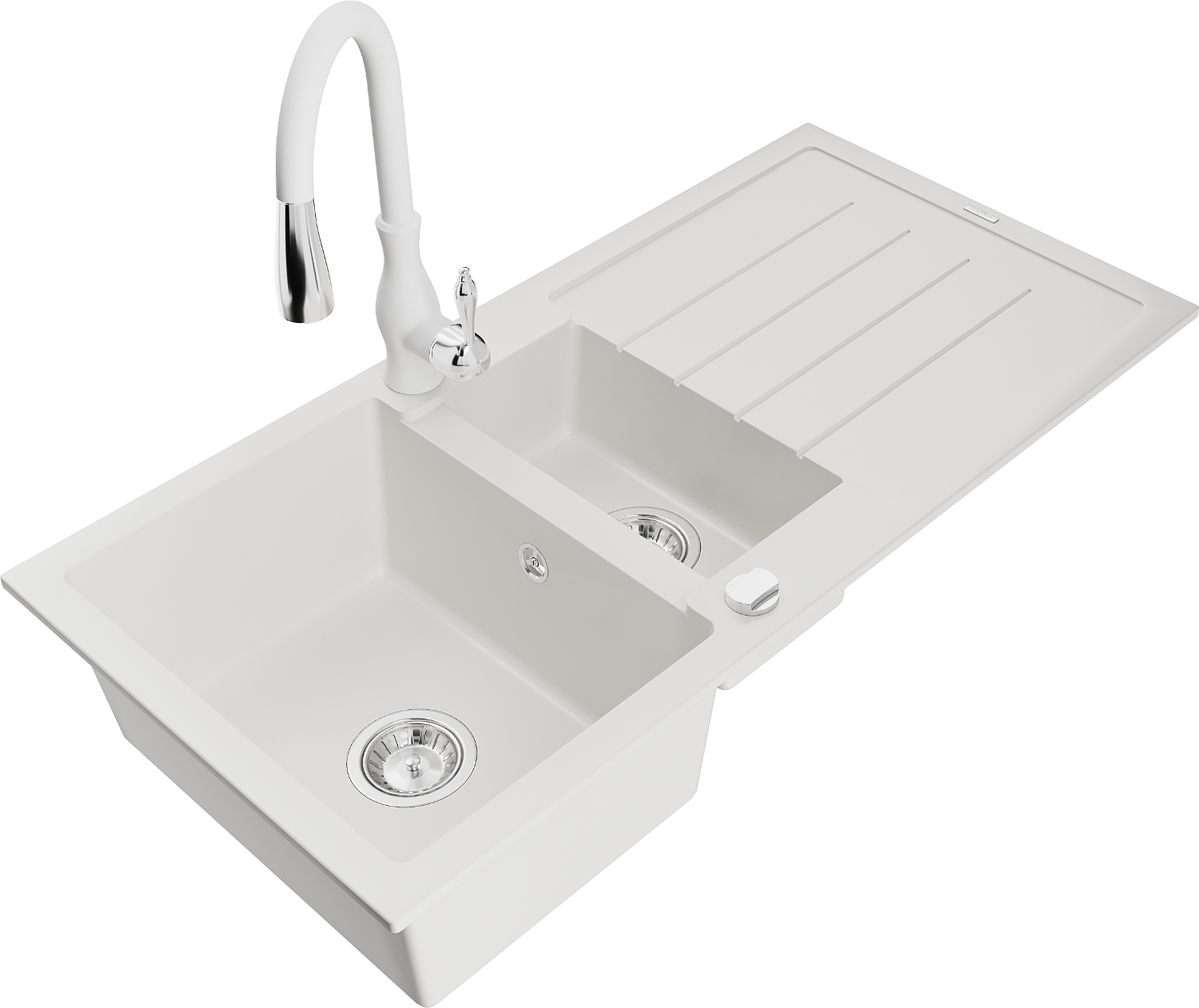 Mexen Andres žulový drez 1,5-komorový s odkvapkávačom a kuchynskou batériou Savita, biely - 6515-20-672601-20