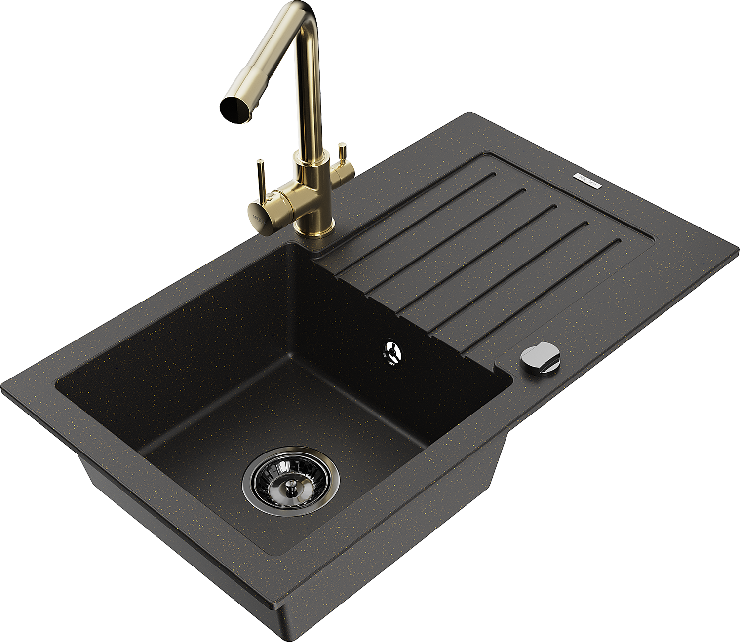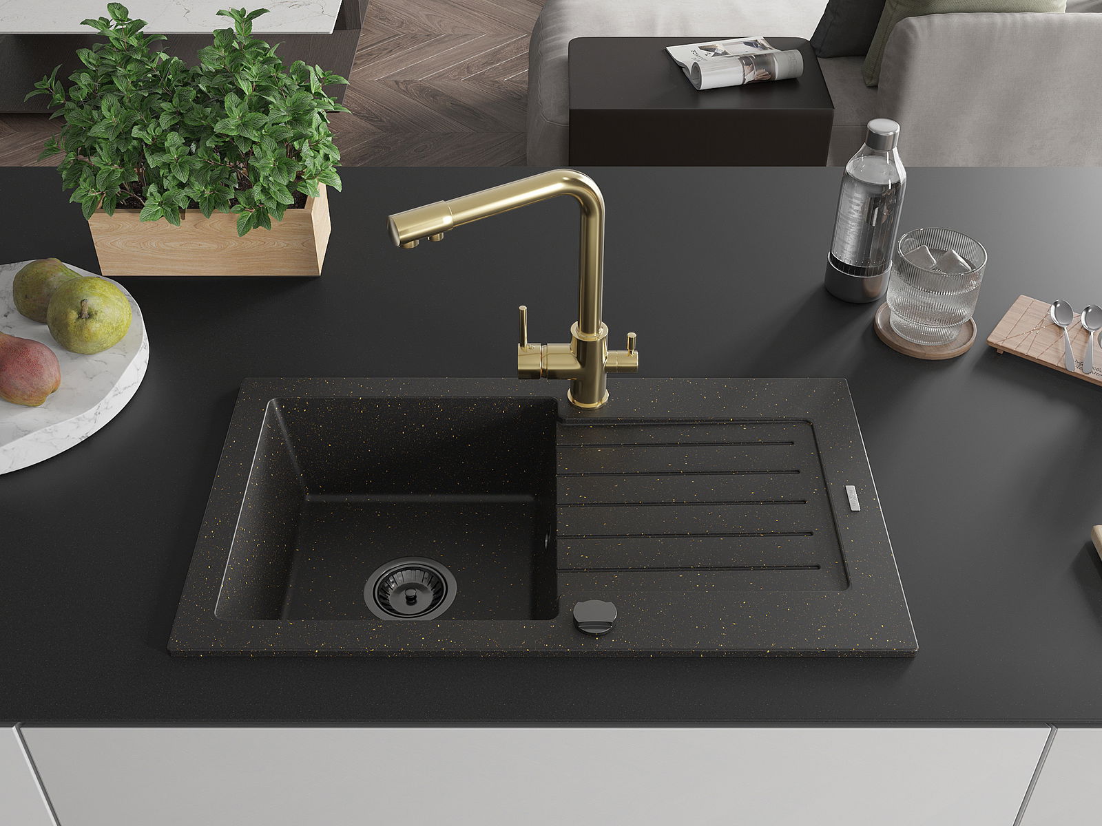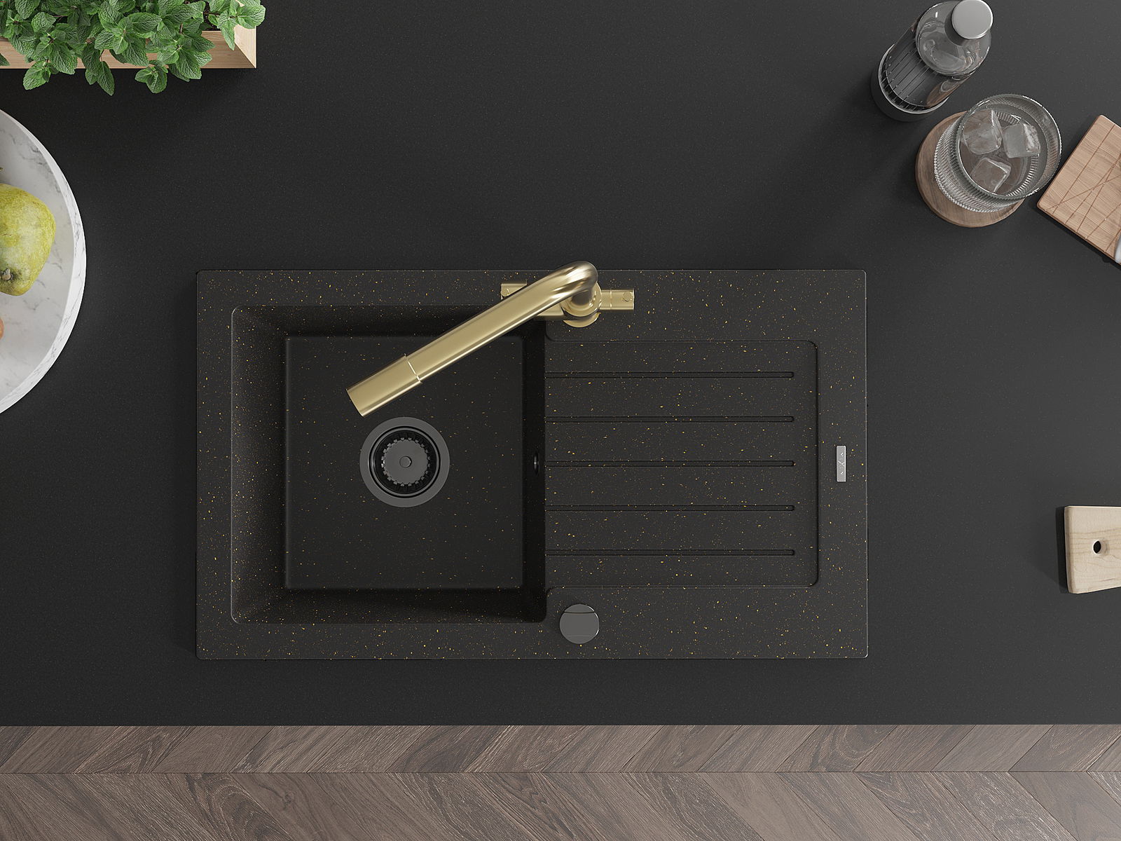 Mexen Pablo granitový drez s 1-komorovým odkvapkávačom a kuchynskou batériou Duero, čierny/zlatý metalik - 6510-75-671600-50-B