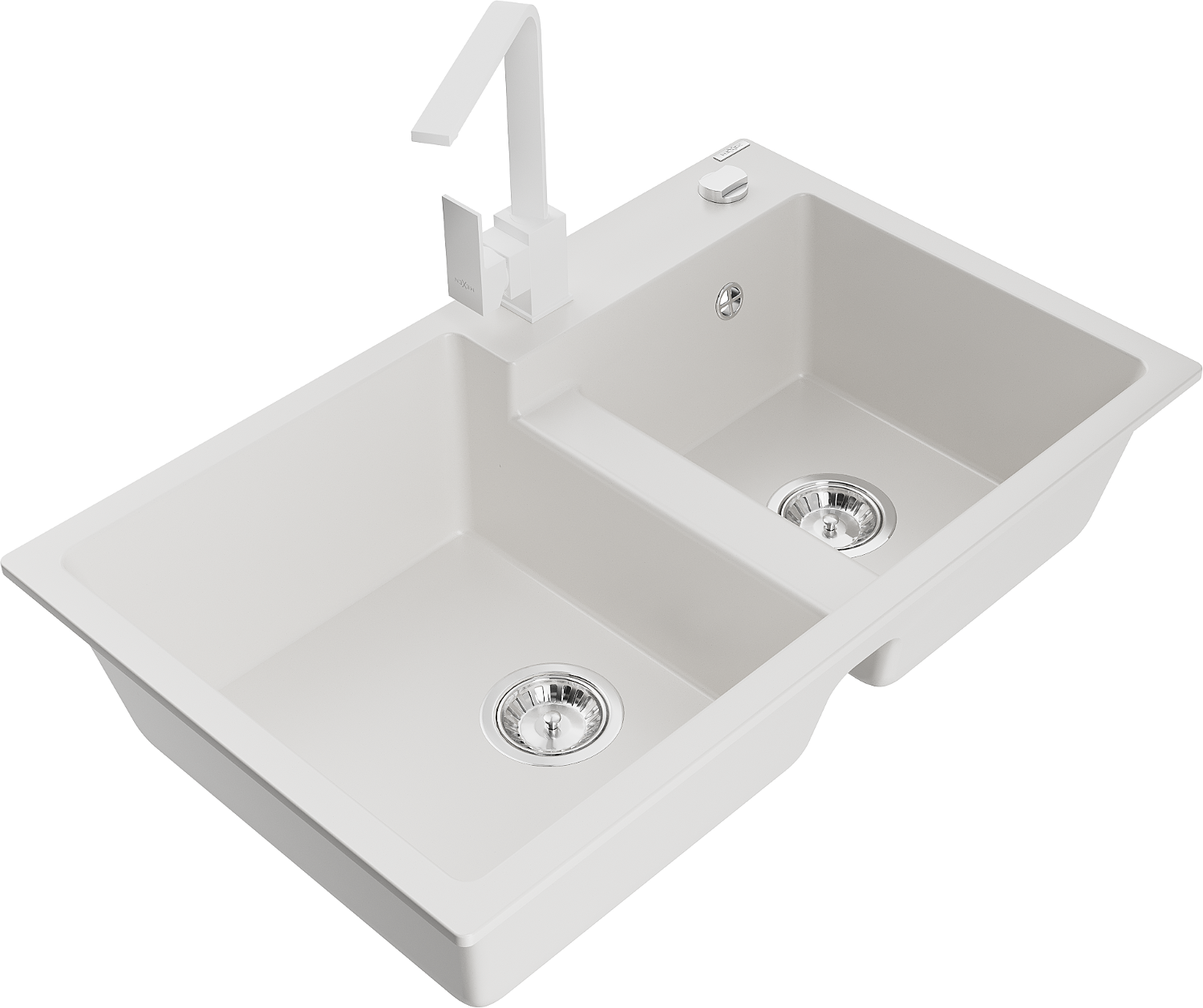 Mexen Tomas dvojkomorový žulový drez s kuchynskou batériou Rita, biely - 6516-20-670300-20