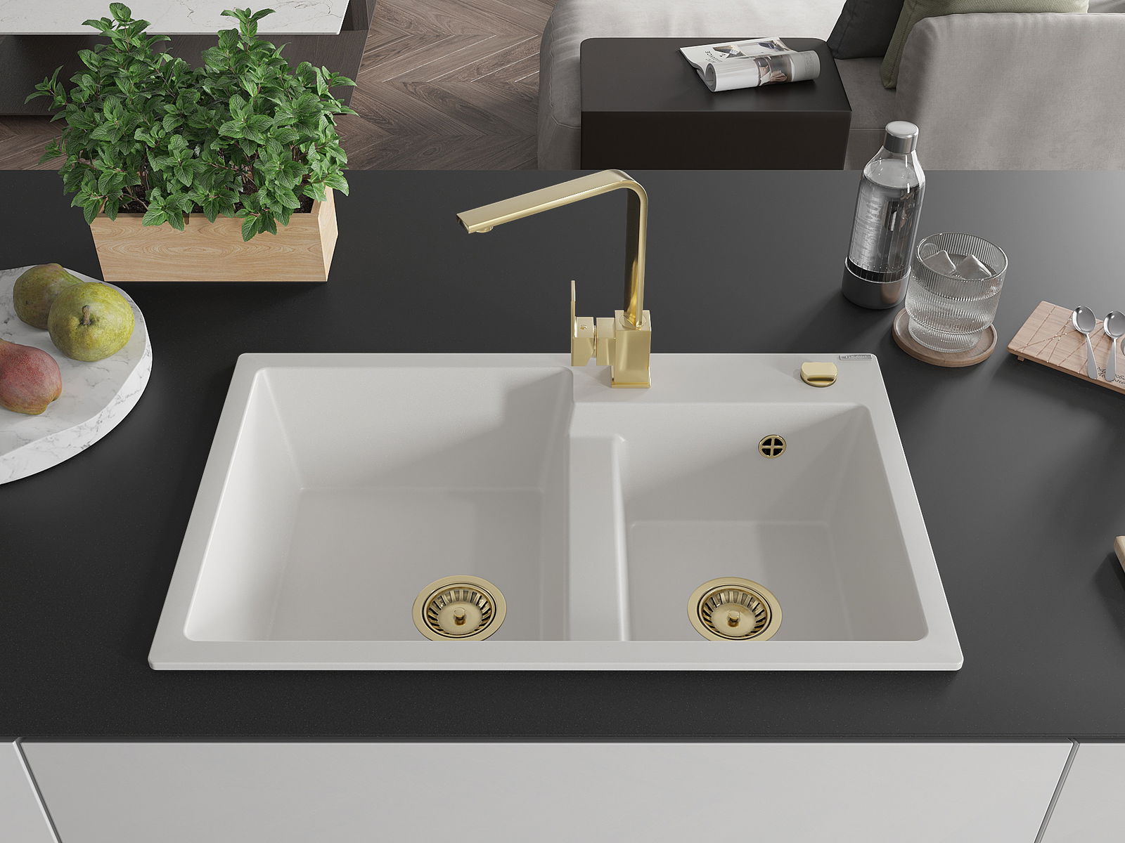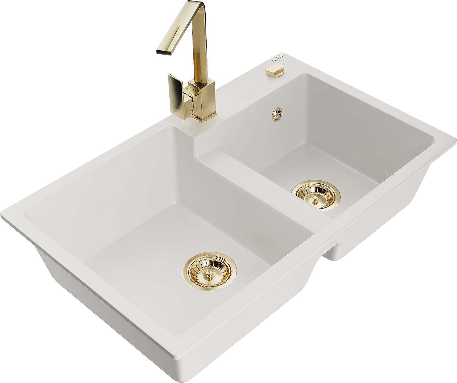 Mexen Tomas žulový dvojkomorový drez s kuchynskou batériou Rita, biela - 6516-20-670300-50