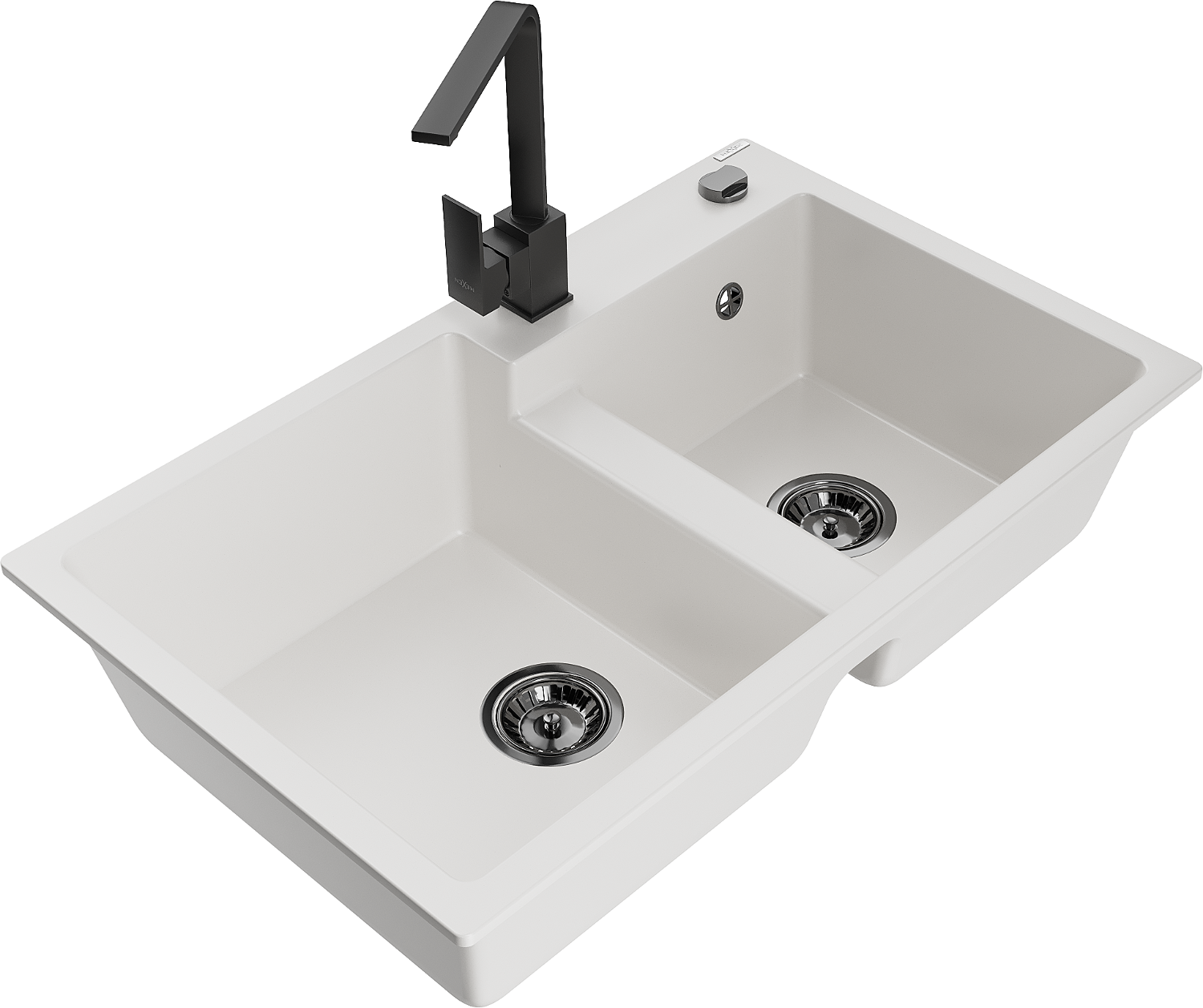 Mexen Tomas žulový drez 2-komorový s kuchynskou batériou Rita, biely - 6516-20-670300-70