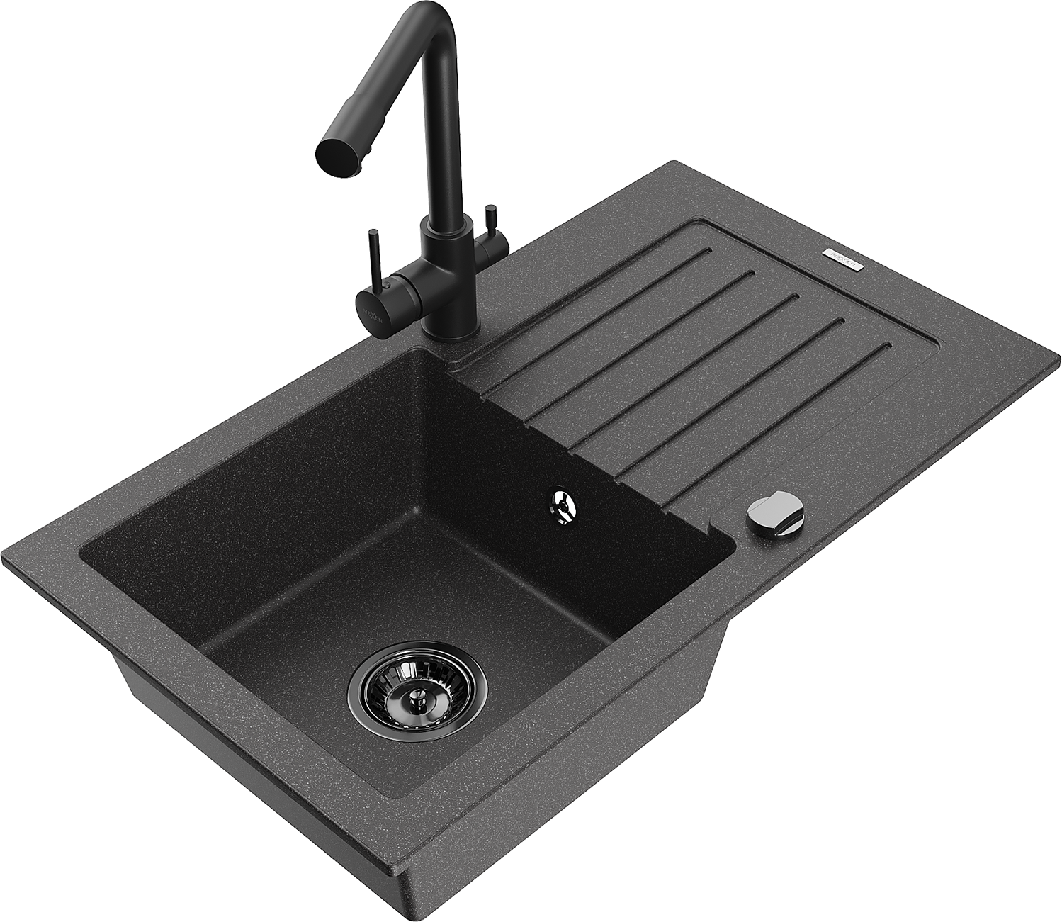 Mexen Pablo granitový drez 1-komorový s odkvapkávačom a kuchynskou batériou Duero, čierna škvrnitá - 6510-76-671600-70-B