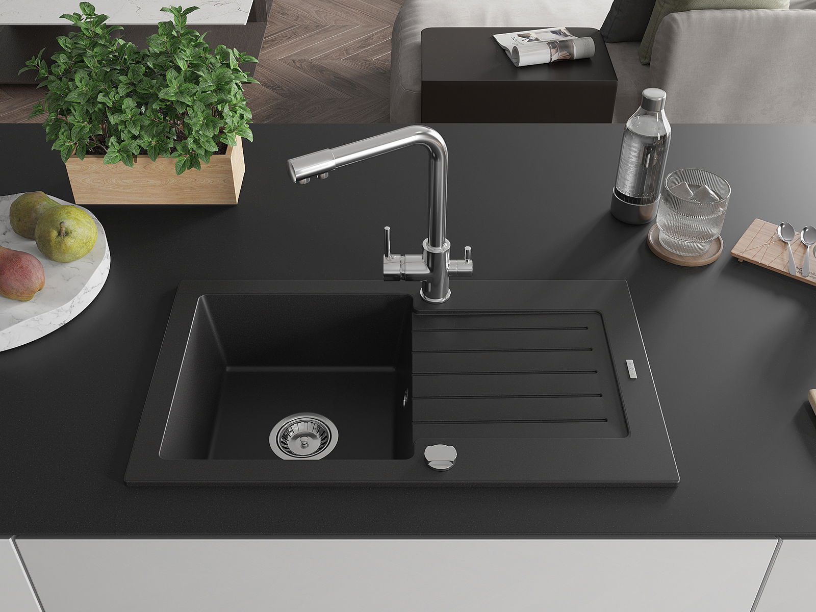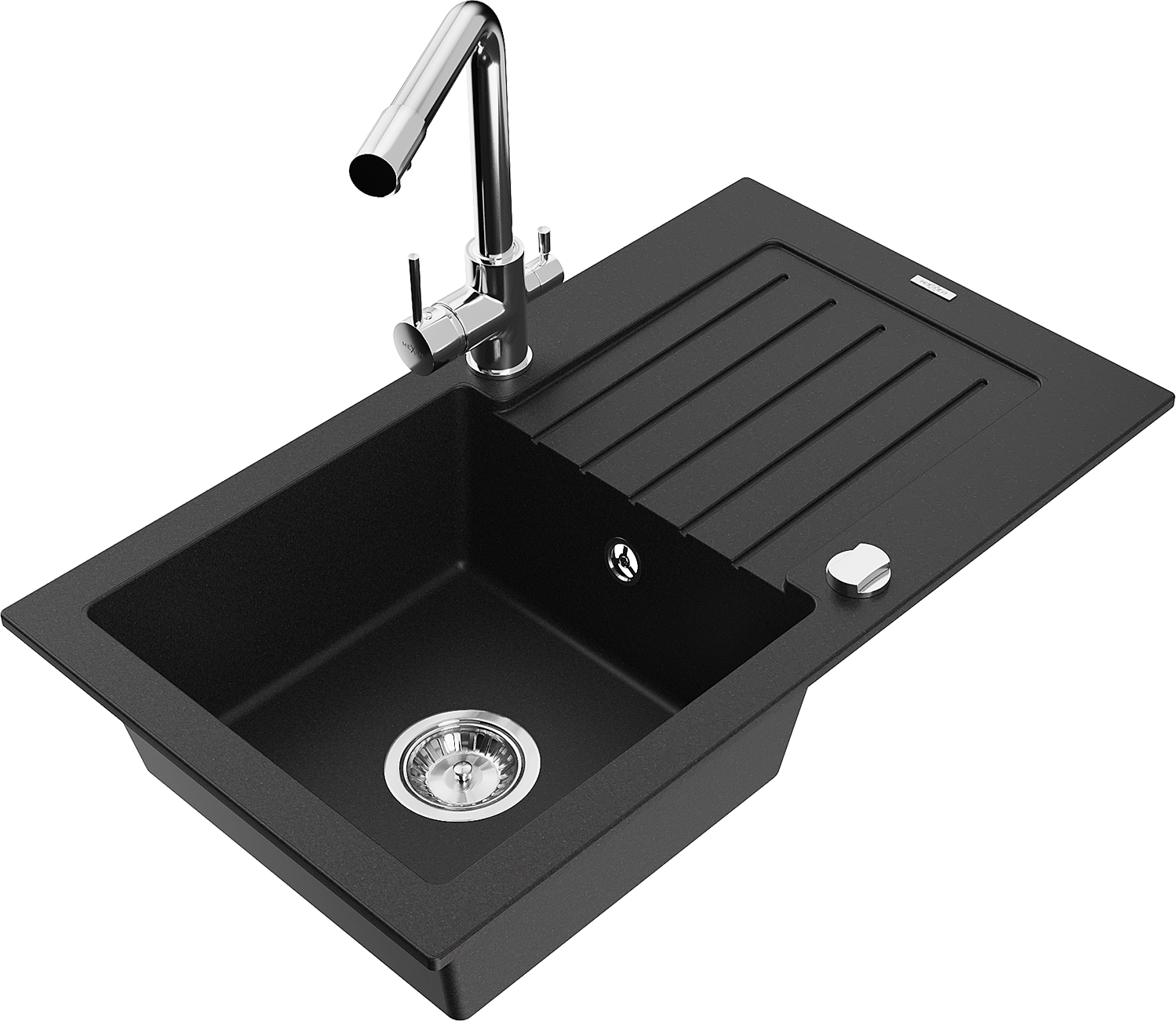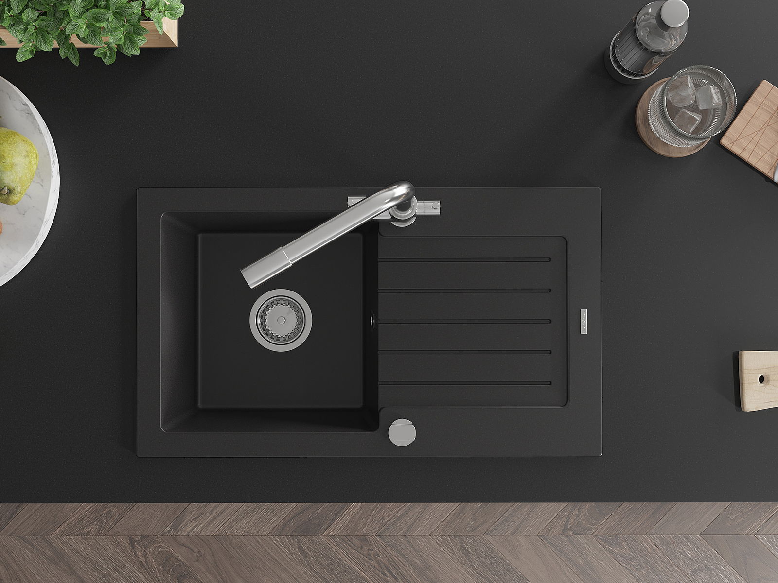 Mexen Pablo žulový kuchynský drez s 1 komorou a odkvapkávačom a kuchynskou batériou Duero, čierny - 6510-77-671600-00