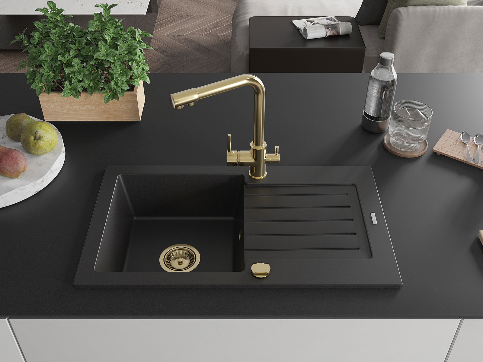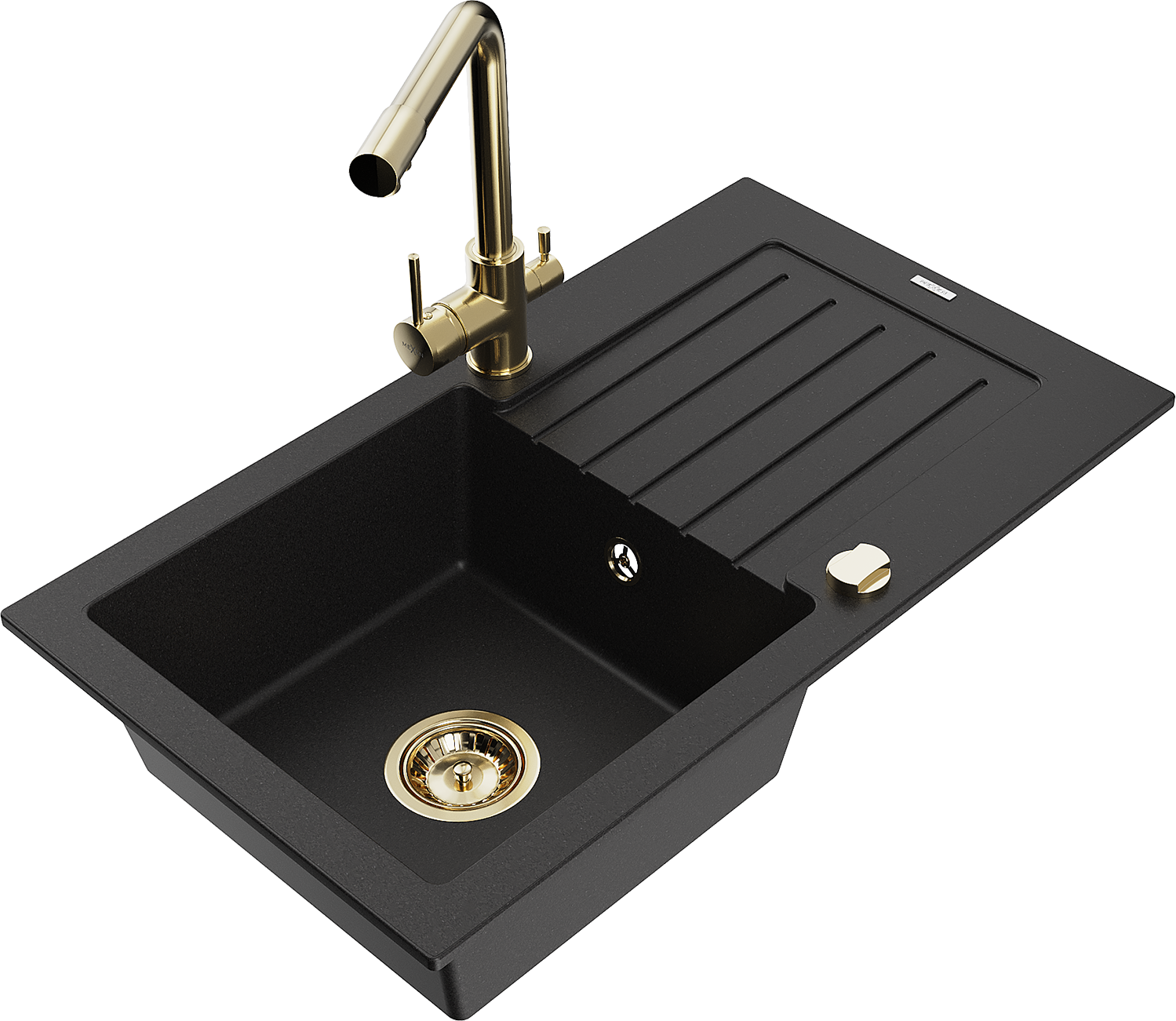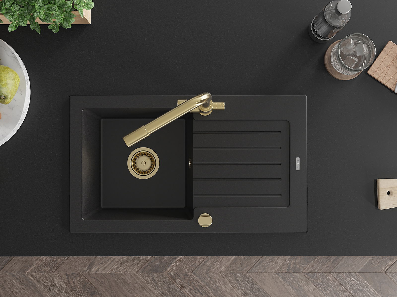 Mexen Pablo žulový drez s 1 komorou a odkvapkávačom a kuchynskou batériou Duero, čierny - 6510-77-671600-50