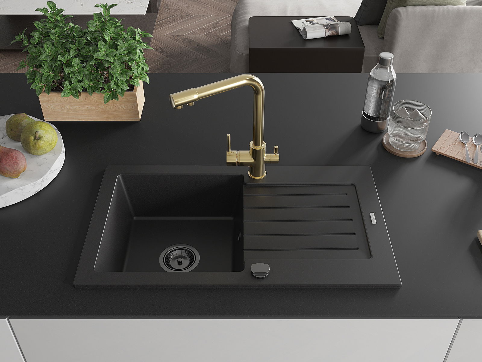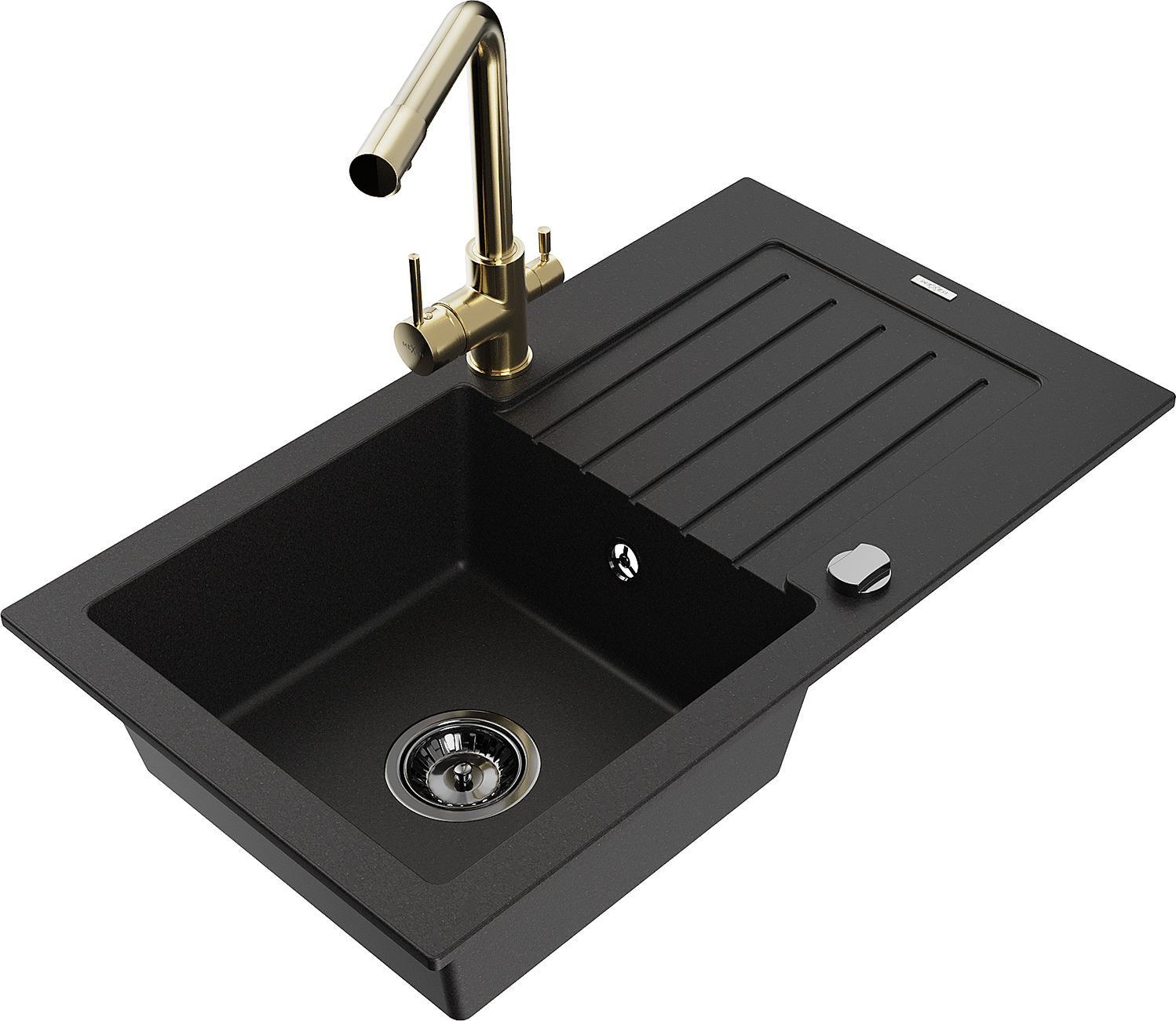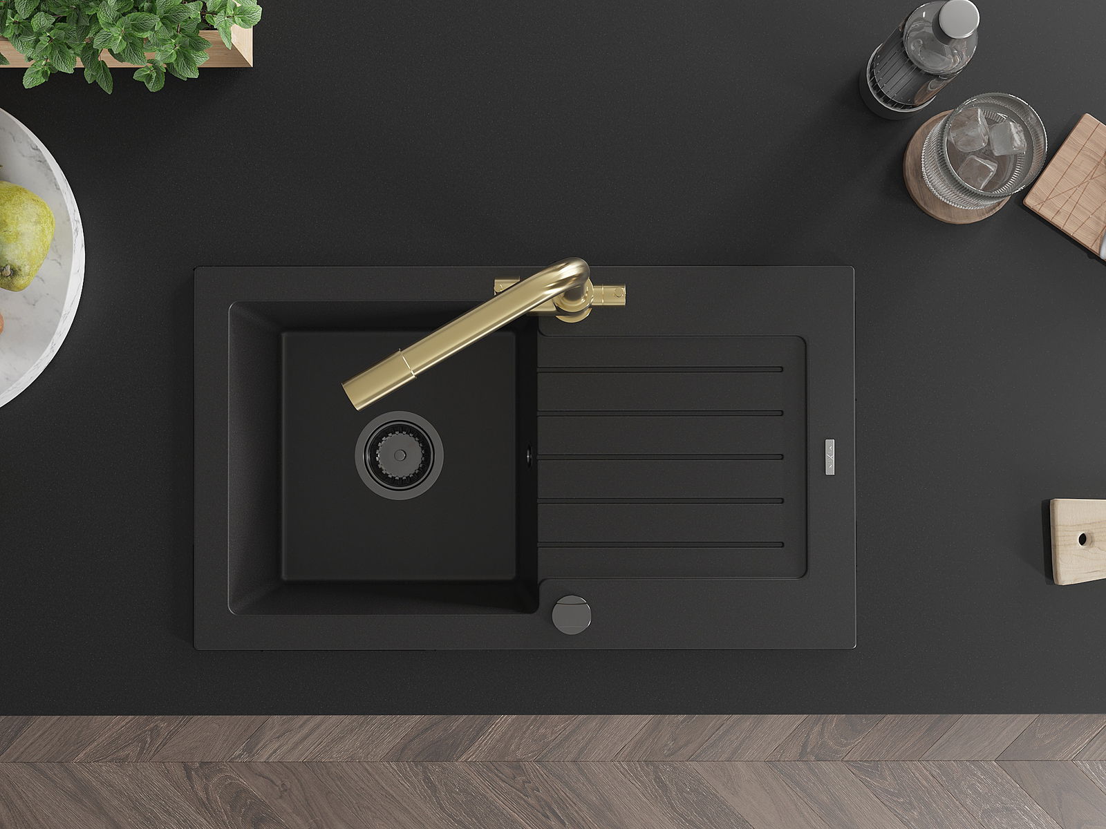 Mexen Pablo žulový kuchynský drez s 1 komorou, odkvapkávačom a kuchynskou batériou Duero, čierny - 6510-77-671600-50-B
