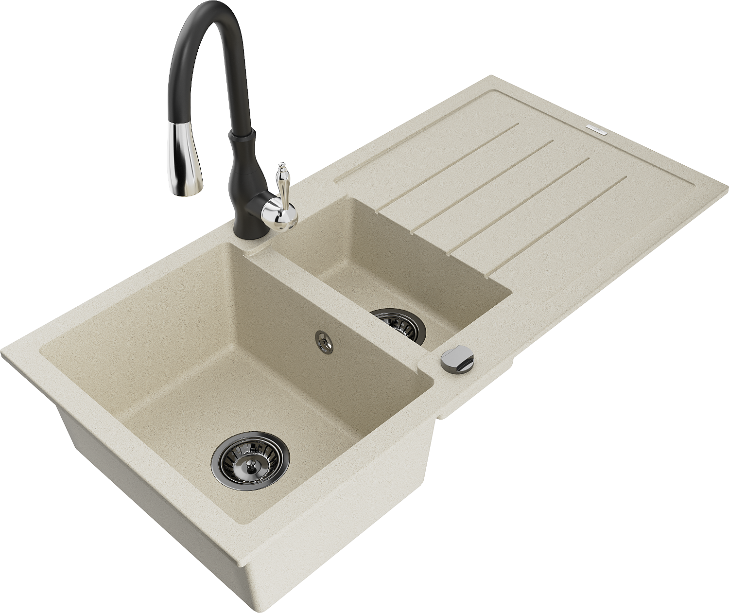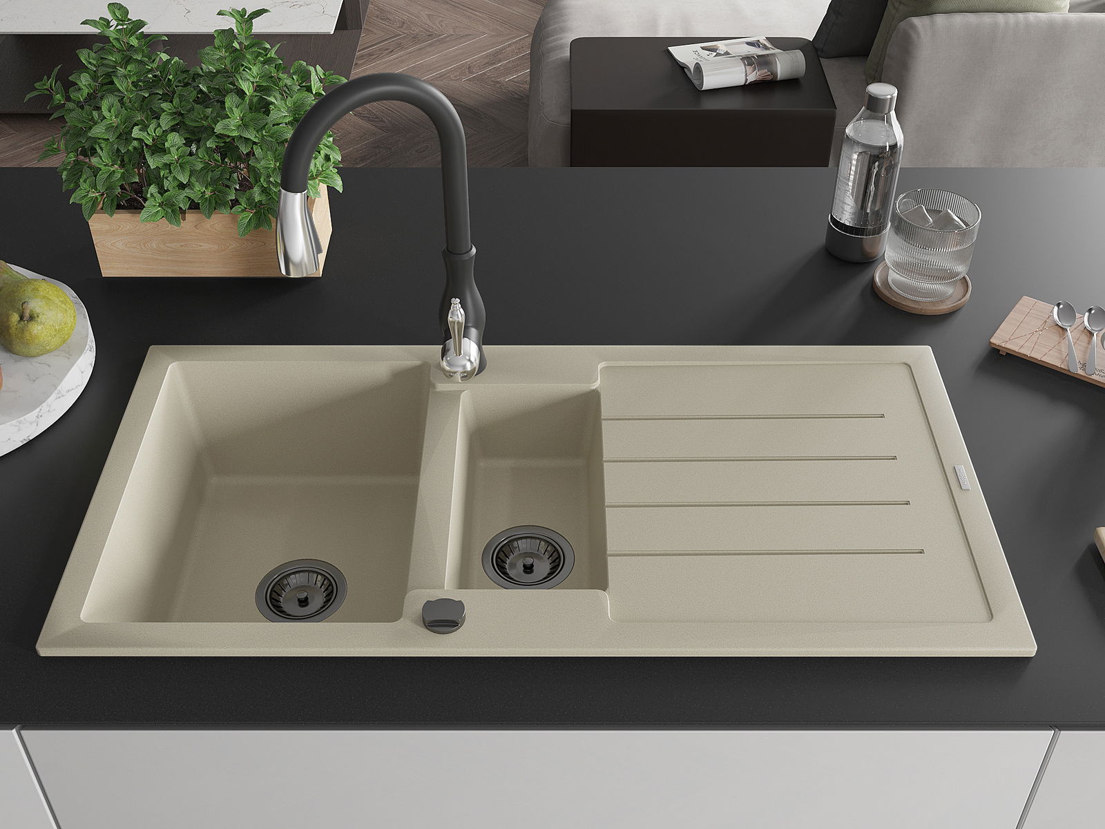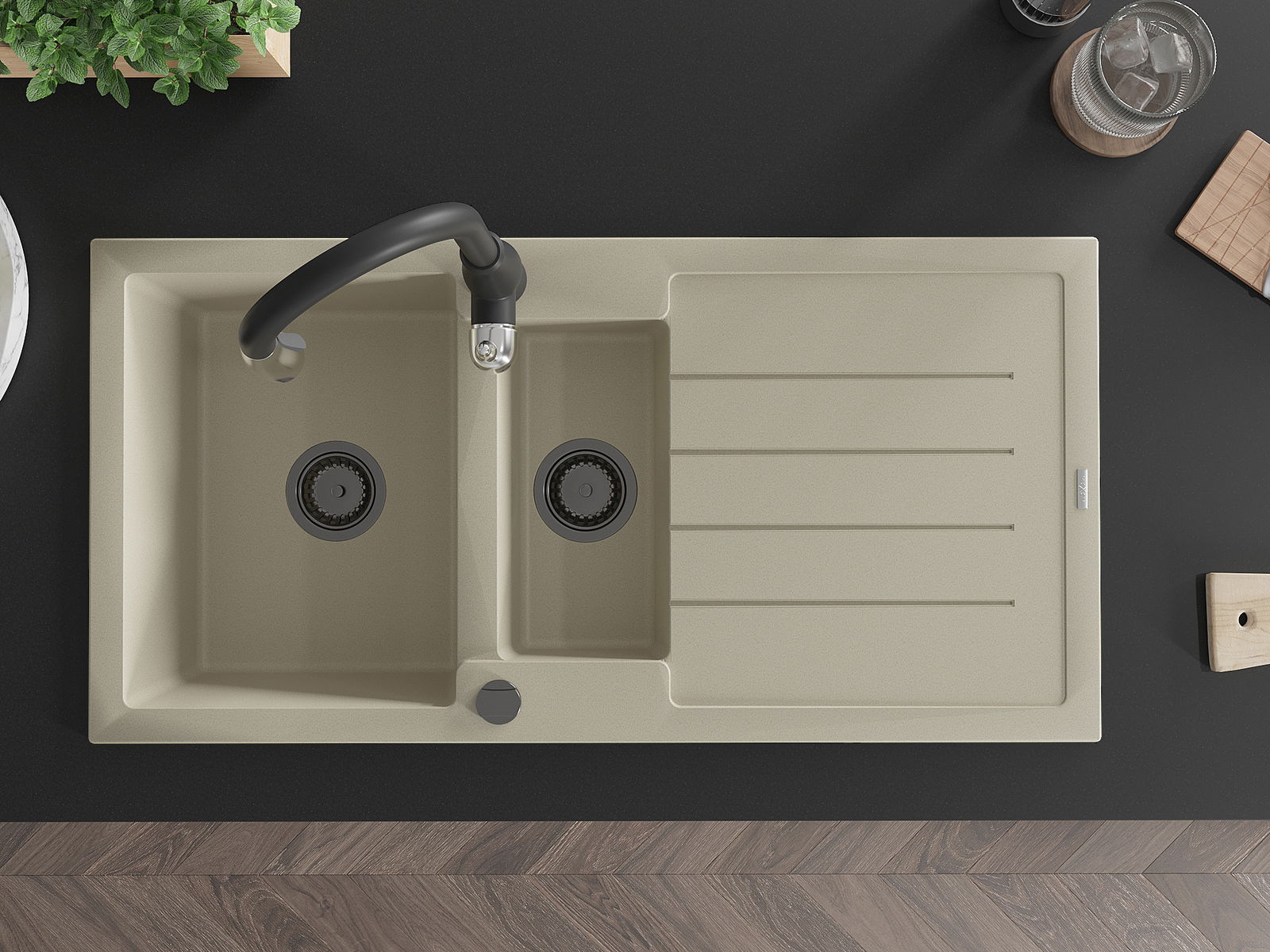 Mexen Andres žulový kuchynský drez 1,5-komorový s odkvapkávačom a kuchynskou batériou Savita, béžový - 6515-69-672601-70