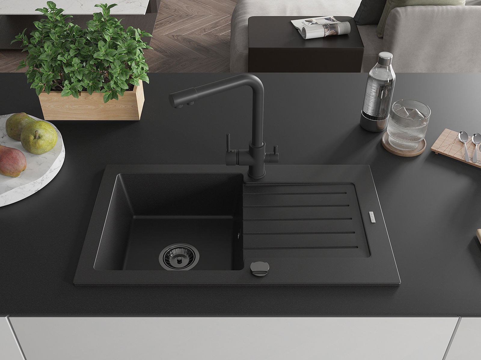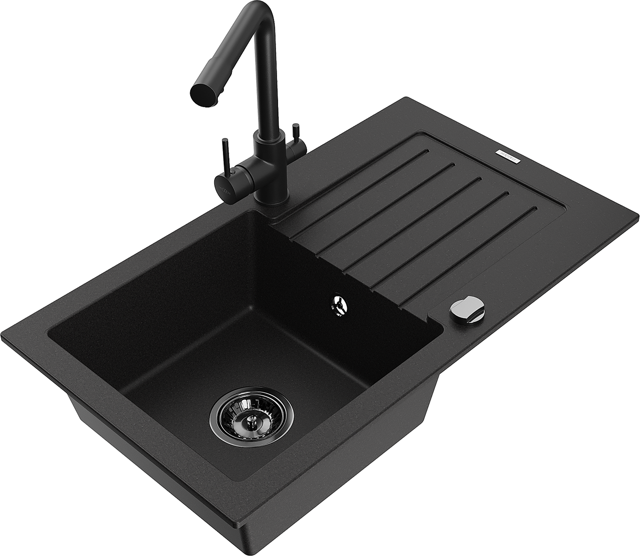 Mexen Pablo granitový kuchynský drez s 1-komorou a odkvapkávačom a kuchynskou batériou Duero, čierna - 6510-77-671600-70-B