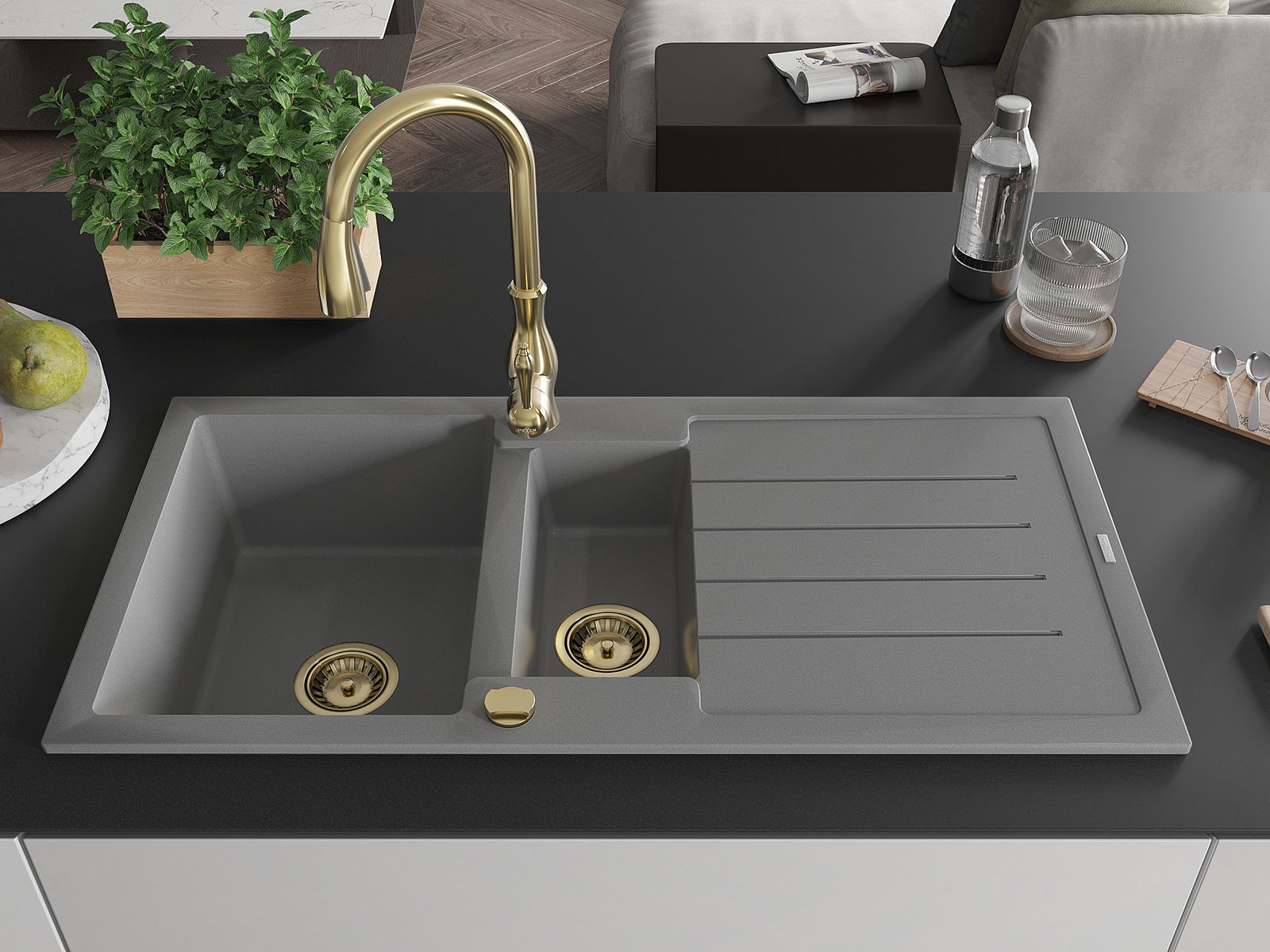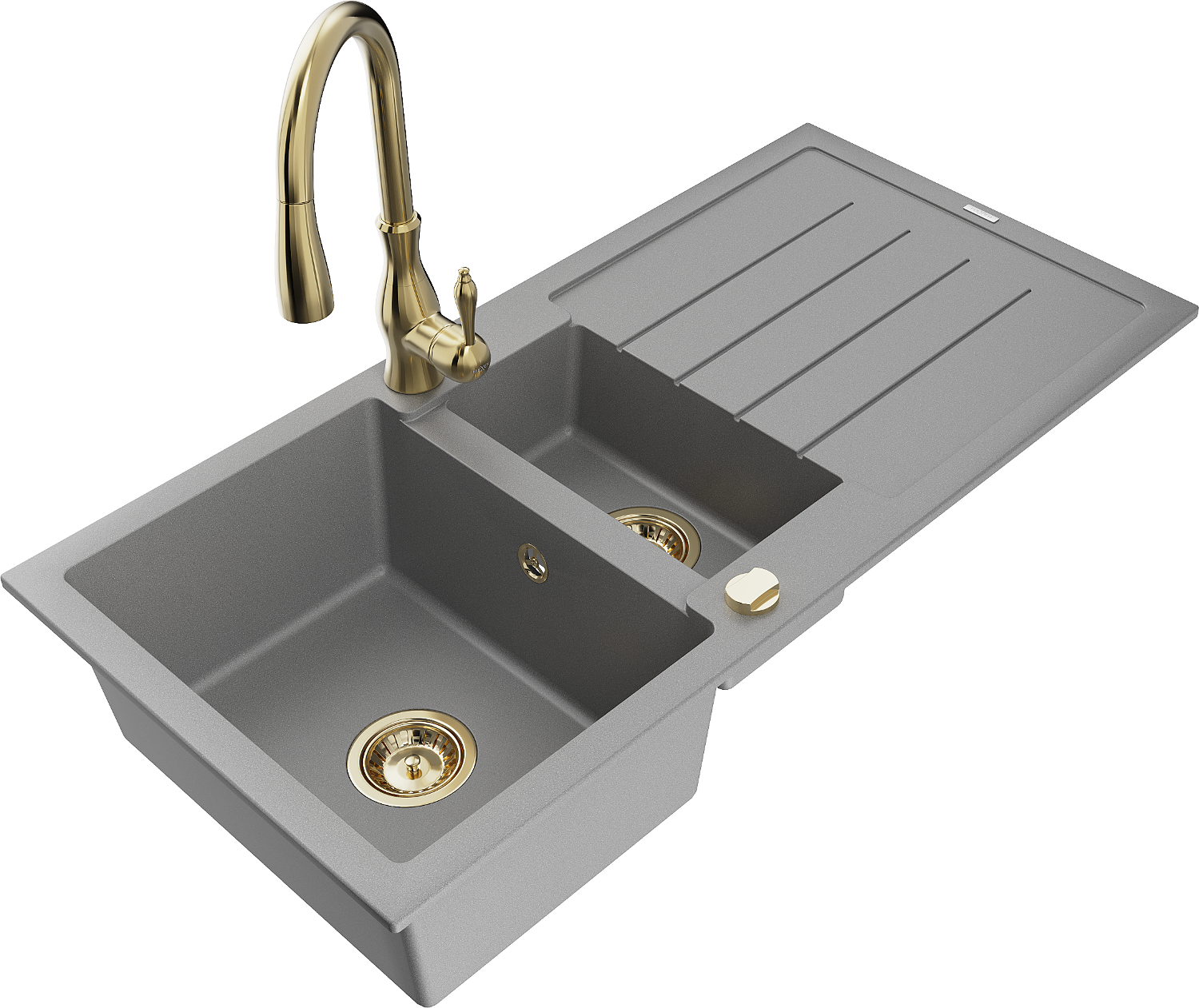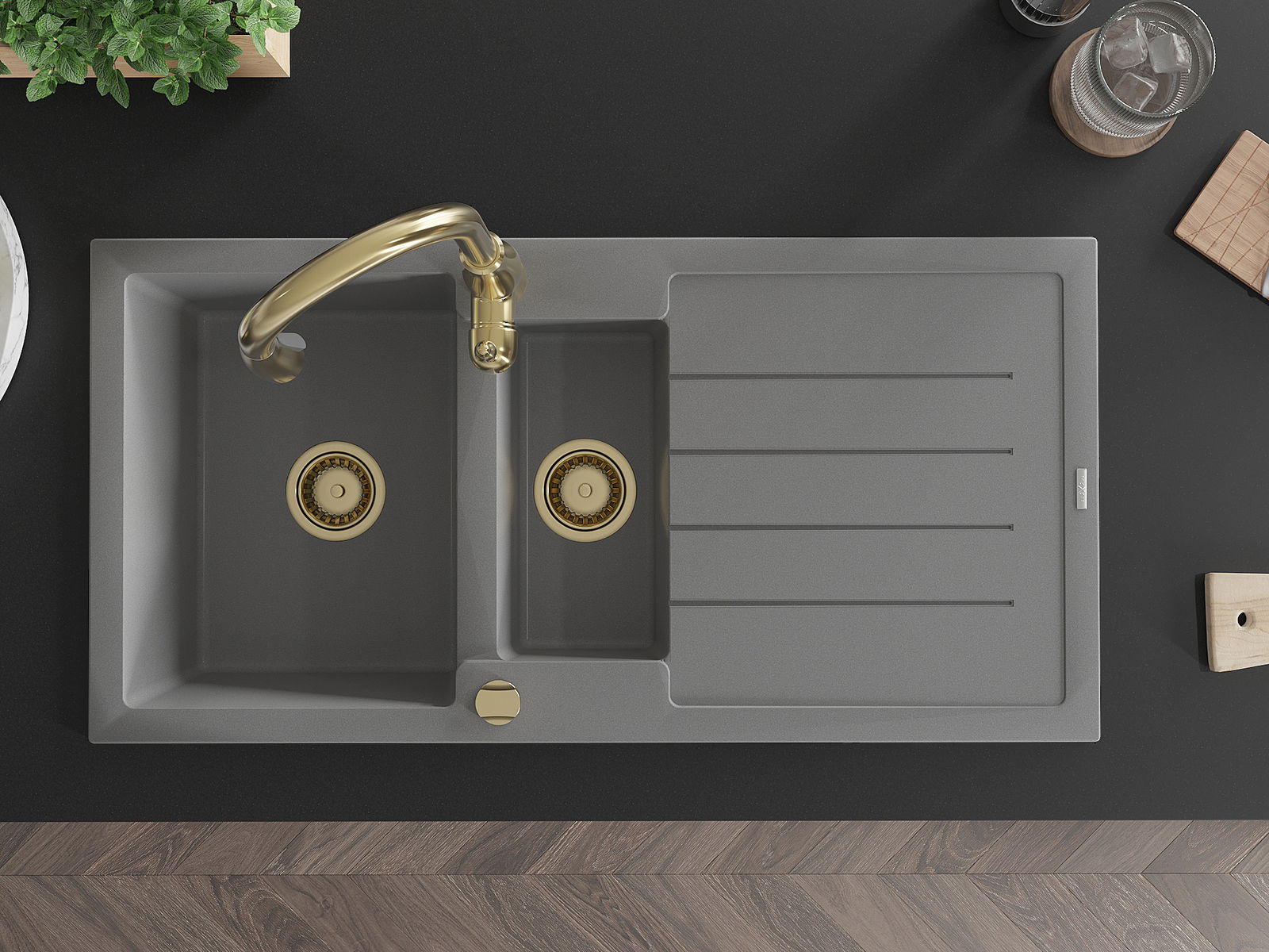 Mexen Andres granitový drez 1,5-komorový s odkvapkávačom a kuchynskou batériou Savita, šedý - 6515-71-672601-50
