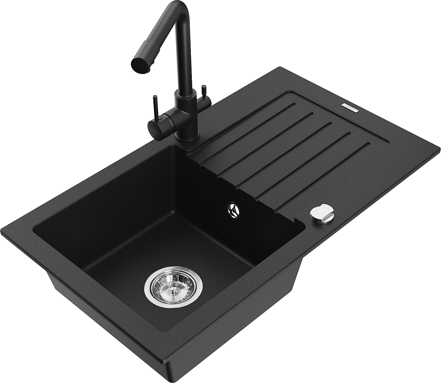 Mexen Pablo žulový kuchynský drez 1-komorový s odkvapkávačom a kuchynskou batériou Duero, čierny - 6510-77-671600-70
