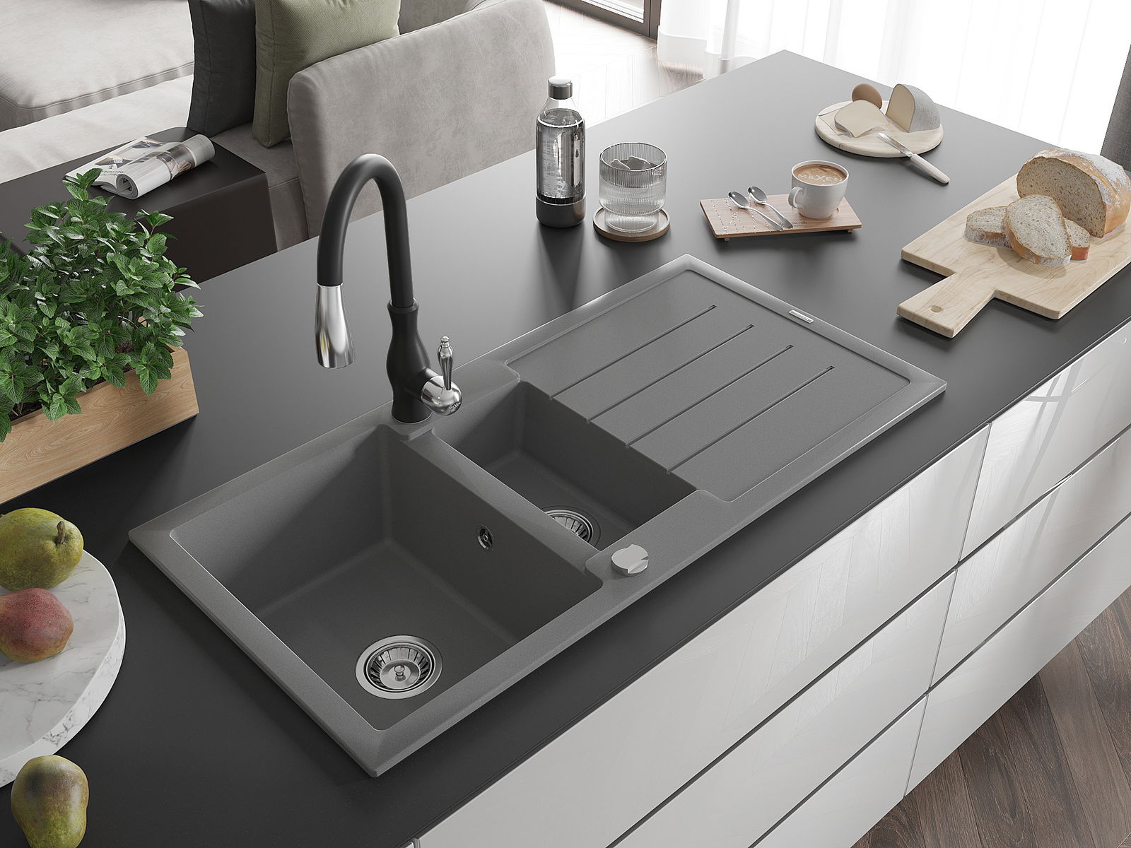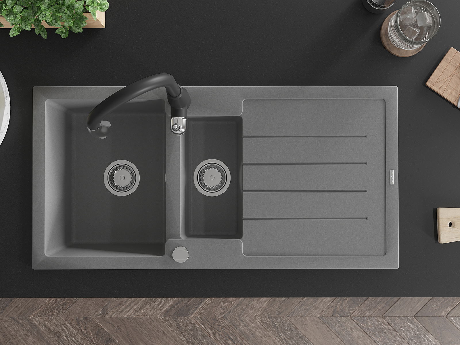 Povrch umývadla je odolný voči škvrnám a sfarbeniu, vďaka čomu sa ľahko čistí a zachováva si svoju farbu po dlhú dobu. Estetický a prakticky dopĺňajúci každú kuchyňu.