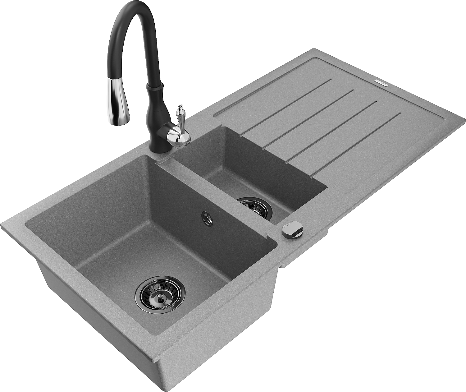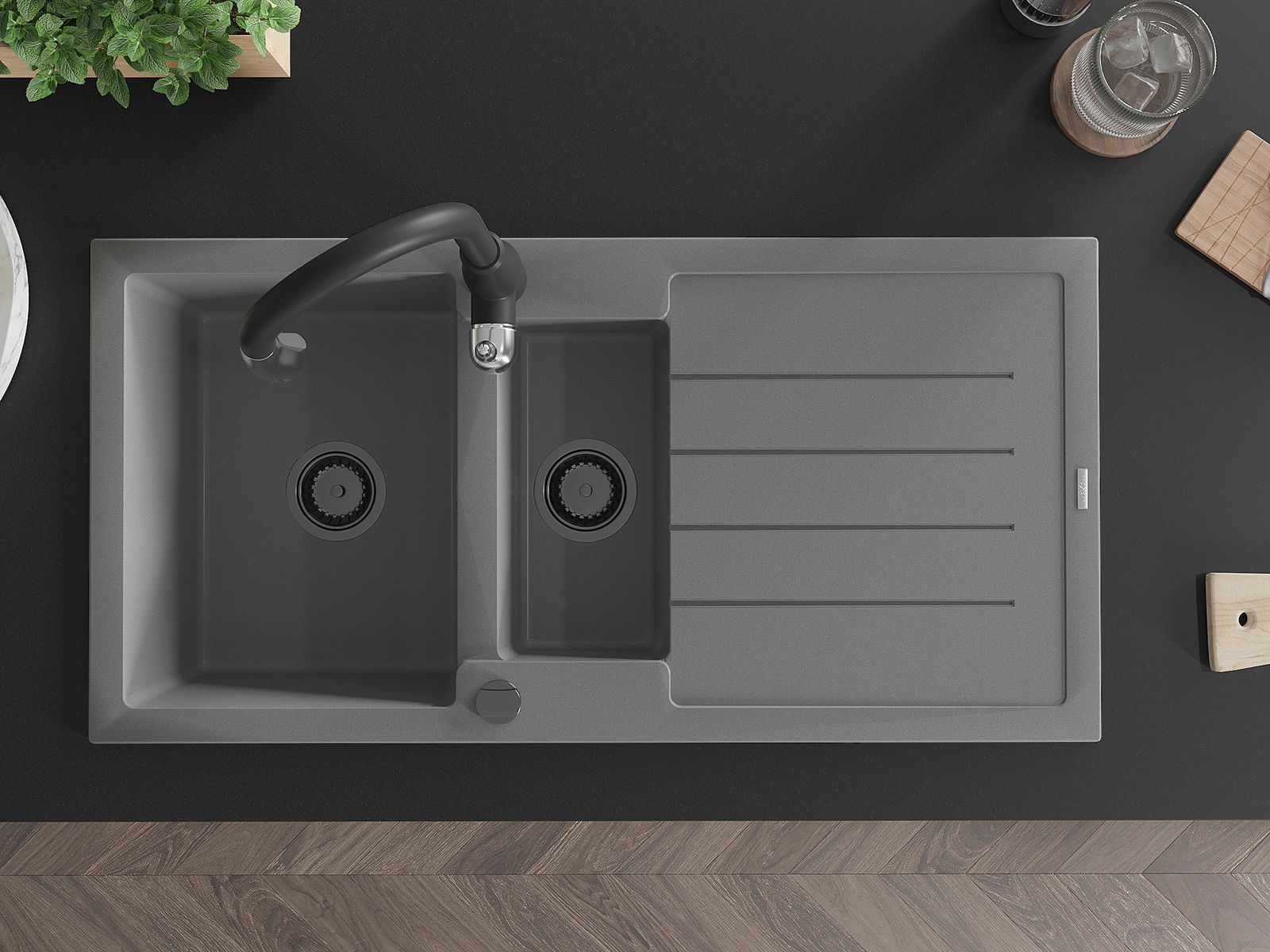 Mexen Andres žulový drez 1,5-komorový s odkvapkávačom a kuchynskou batériou Savita, sivý - 6515-71-672601-70-B