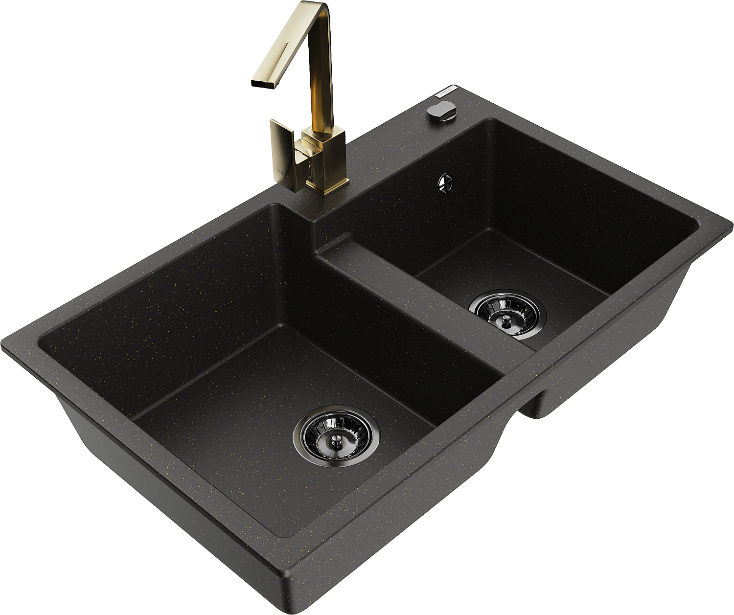 Mexen Tomas granitový drez 2-komorový s kuchynskou batériou Rita, čierny/zlatý metalik - 6516-75-670300-50-B