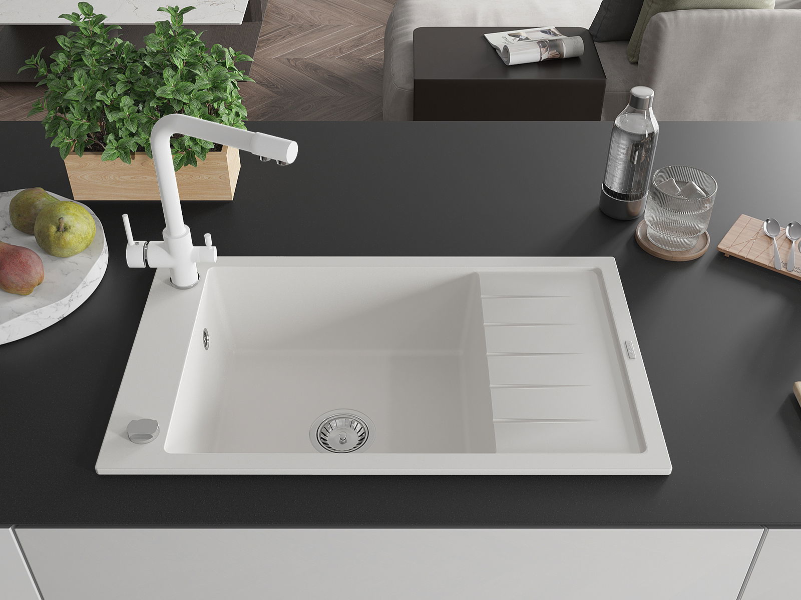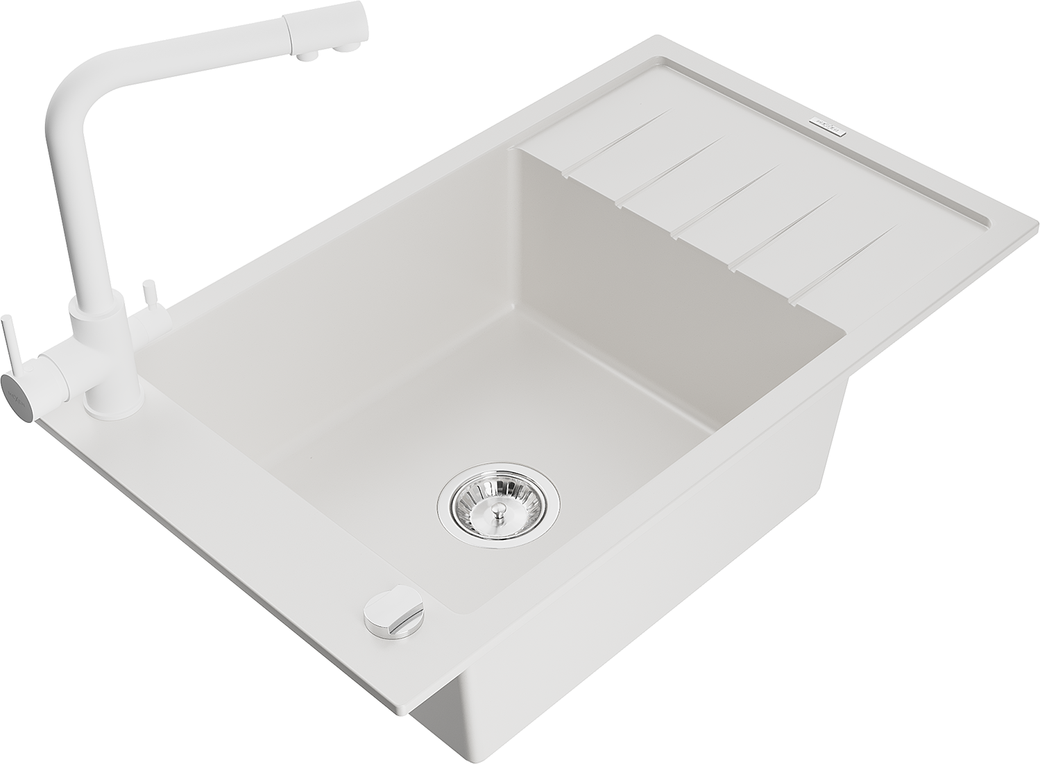 Mexen Elias granitový drez s 1 komorou a odkvapkávačom a kuchynskou batériou Duero, biela - 6511-20-671600-20