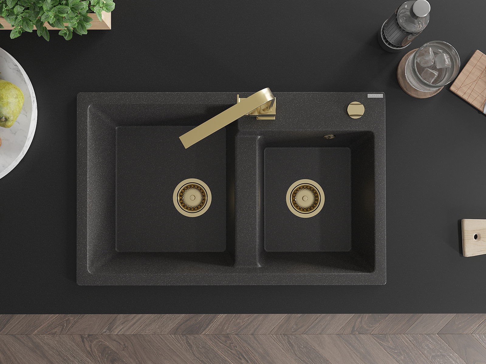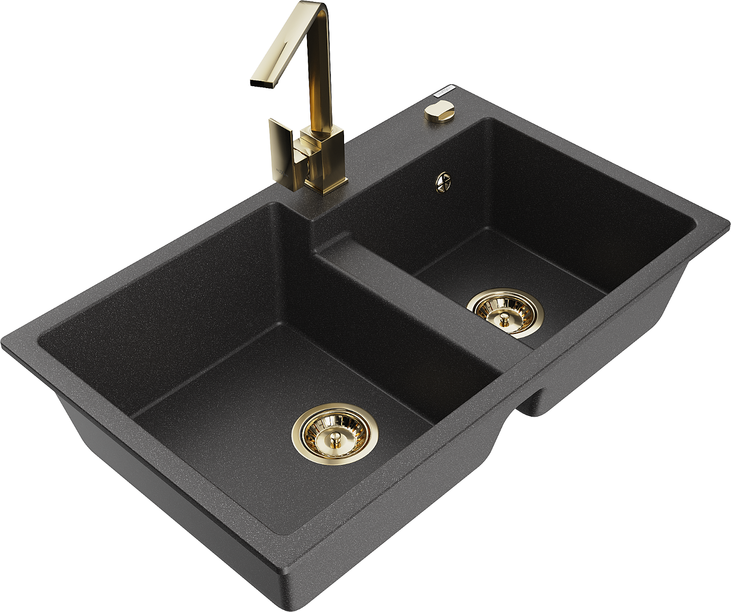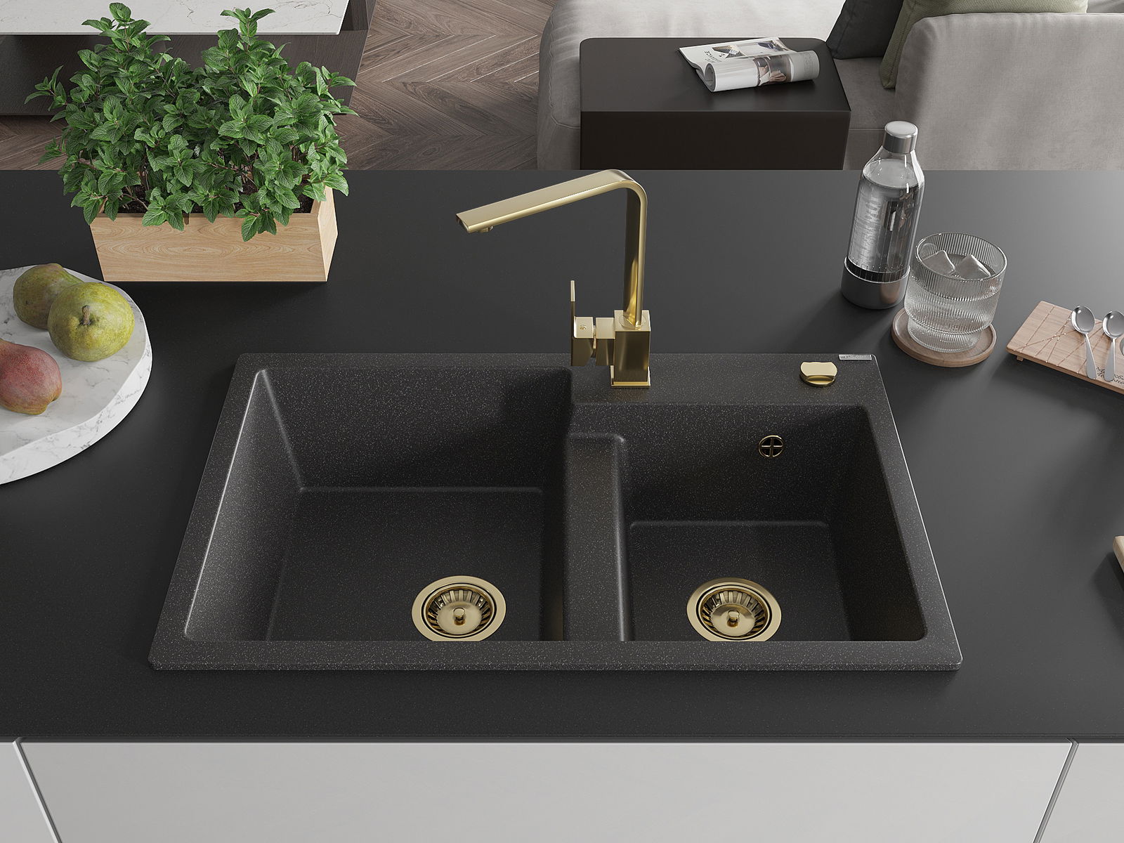 Mexen Tomas žulový drez 2-komorový s kuchynskou batériou Rita, čierny škvrnitý - 6516-76-670300-50