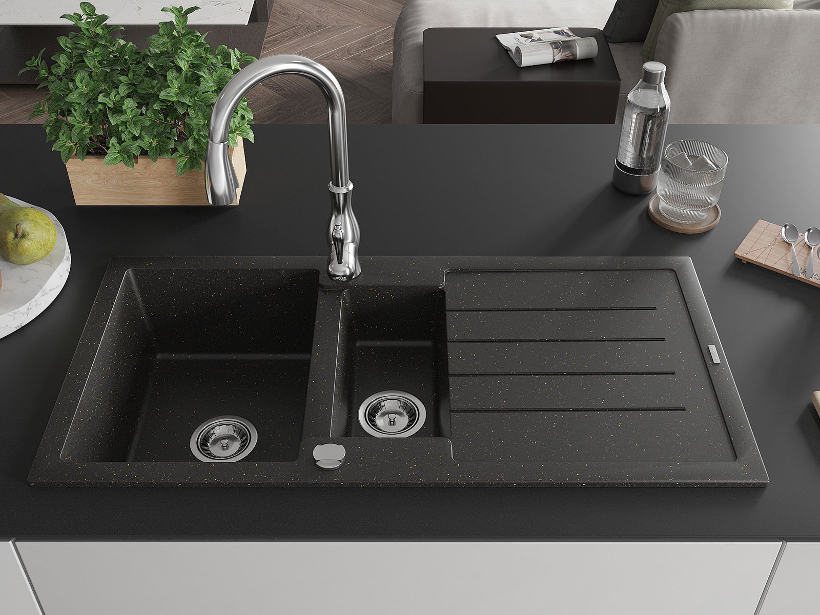 Dozkok má 2 spojené diery s priemerom 35 mm, pre seba -burst. Môžu sa okrem iného použiť Na montáž tekutého dávkovača, ktorý eliminuje prítomnosť plastových fliaš v kuchyni a dodá mu elegantný povrch.