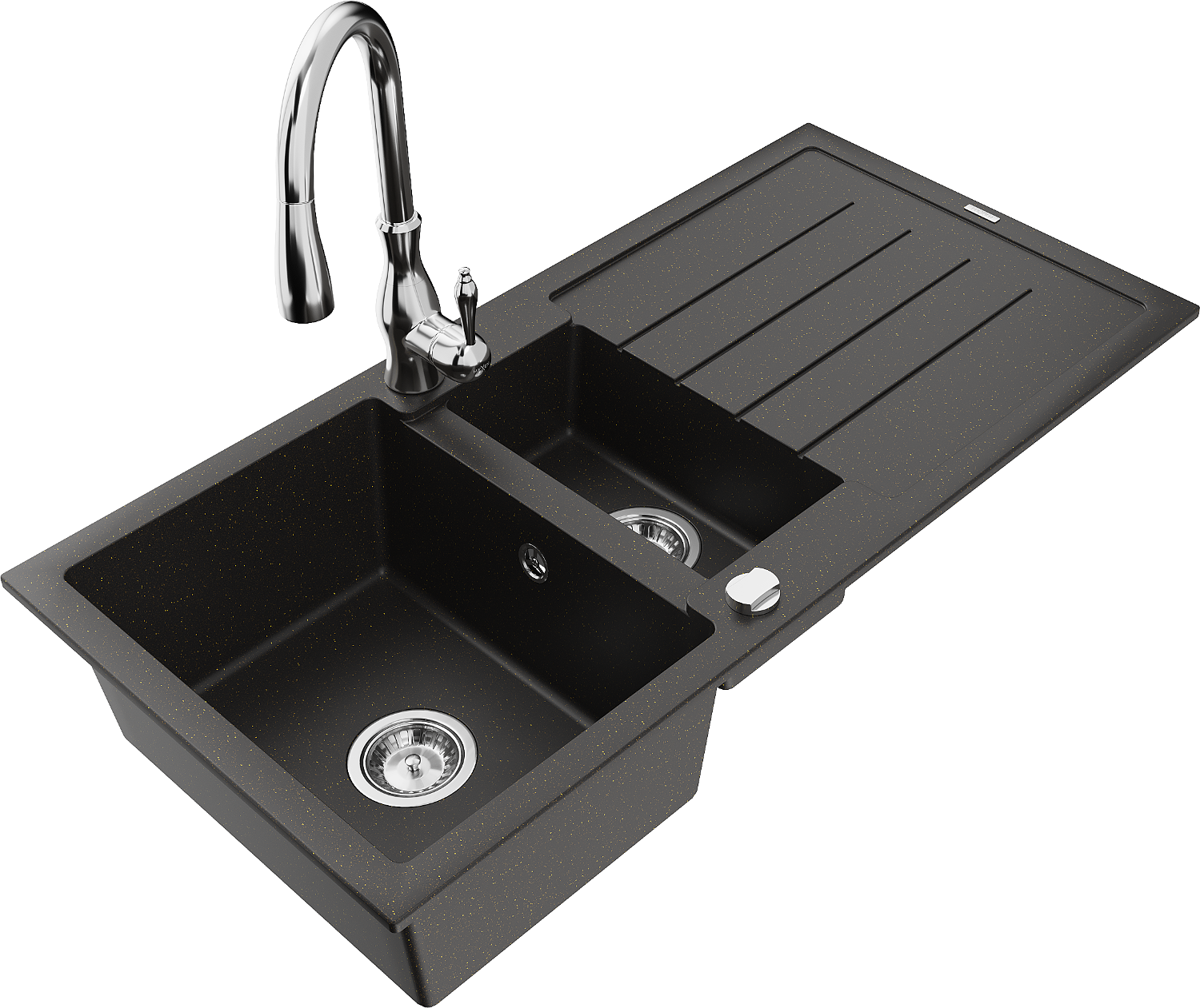 Mexen Andres granitový drez s 1,5 komorou a odkvapkávačom a kuchynskou batériou Savita, čierny/zlatý metalik- 6515-75-672601-00