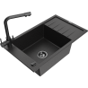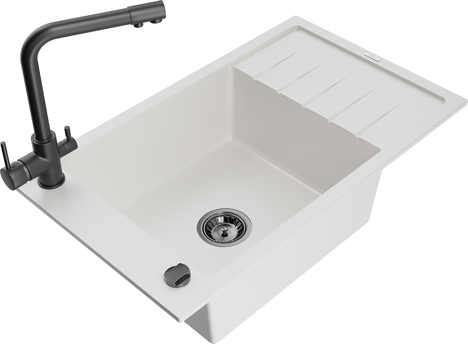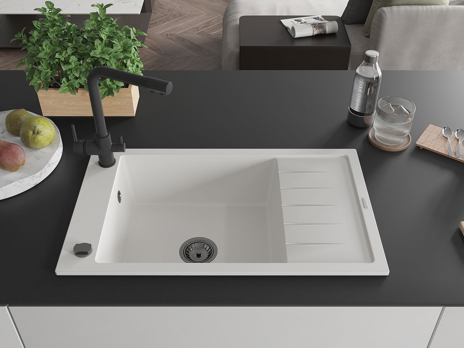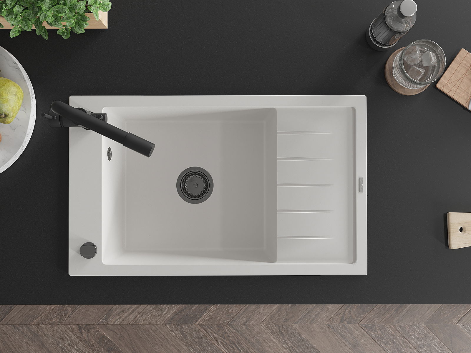 Mexen Elias žulový drez 1-komorový s odkvapkávadlom a kuchynskou batériou Duero, biely - 6511-20-671600-70