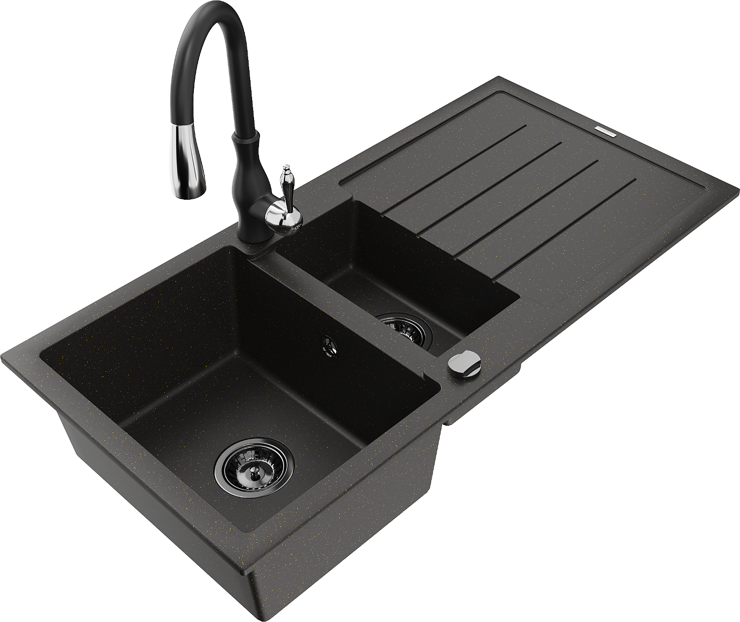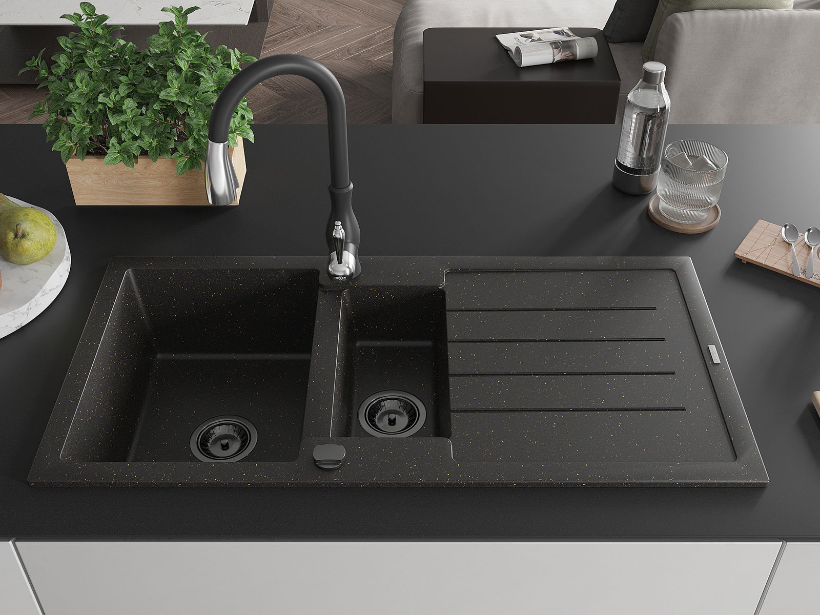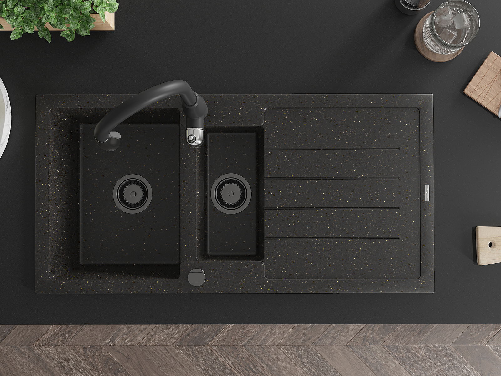 Mexen Andres žulový drez s 1,5 komory a odkvapkávačom a kuchynská batéria Savita, čierny/zlatý - 6515-75-672601-70-B
