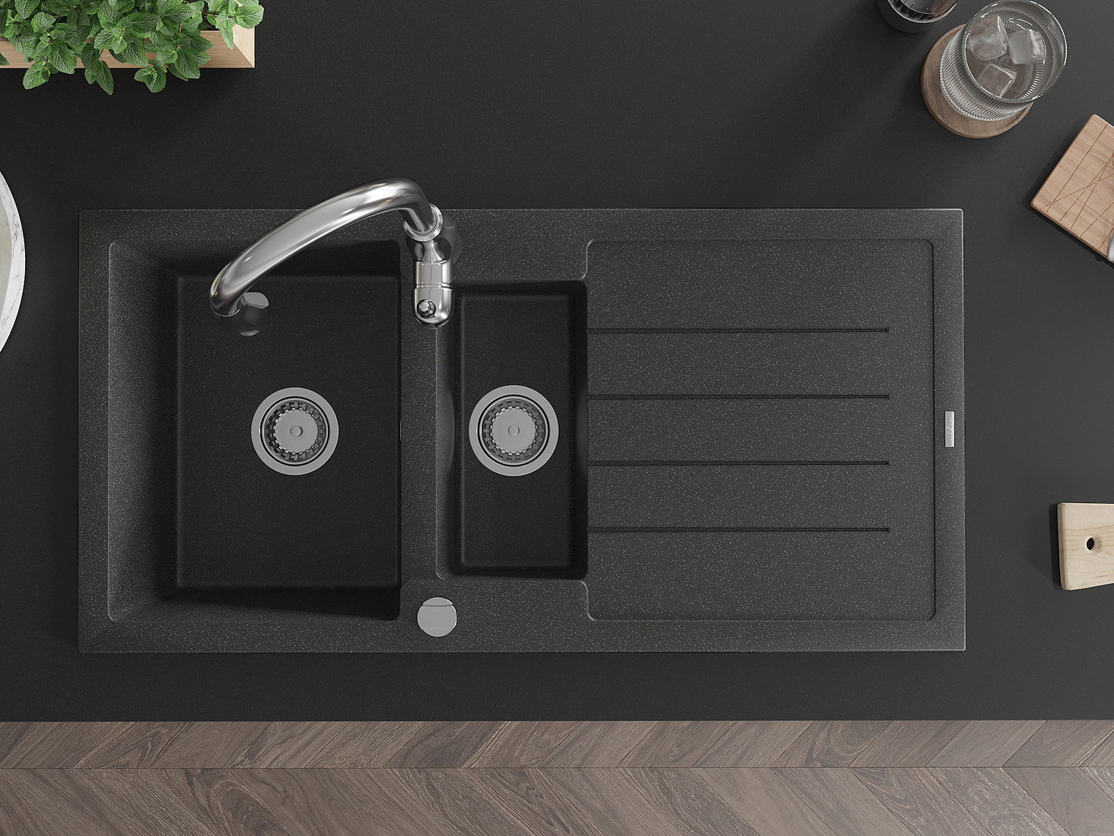 Mexen Andres granitový drez s 1,5-komorou s odkvapkávačom a kuchynskou batériou Savita, čierna špliechaná - 6515-76-672601-00